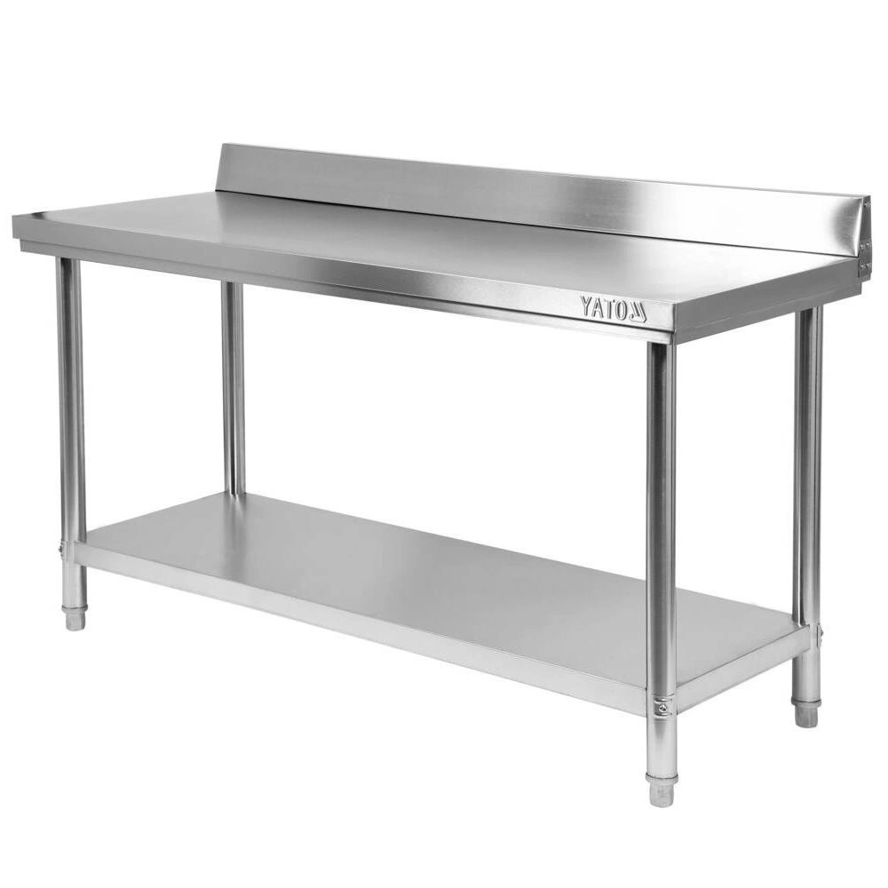Nástěnný pracovní stůl s pracovní deskou o rozměrech 150x60x85 cm od společnosti YATO. Stupátko je vyrobeno z vysoce kvalitní nerezové oceli SS201, která zaručuje odolnost vůči intenzivnímu používání. Díky pečlivě opracovaným svařovaným spojům a hladkým povrchům je stůlóel nejen odolný, ale také se velmi snadno udržuje v čistotě, což je v profesionálních kuchyních zásadní. Deska stolu je vyrobena z robustního plechu o tloušťce 0,8 mm s přídavnými zpevňujícími profily. Kromě toho byla zespodu vyztužena dřevěnou laminovanou deskou o tloušťce 20 mm, díky čemuž je nejen tužší a zvukotěsná, ale také odolná vůči vlhkosti. Díky tomu vydrží stolová deska zatížení až 150 kg. Dodatečný 100 mm vysoký okraj v zadní části pracovní desky zabraňuje padání zbytků jídla za stůl, což zvyšuje hygienické standardy.