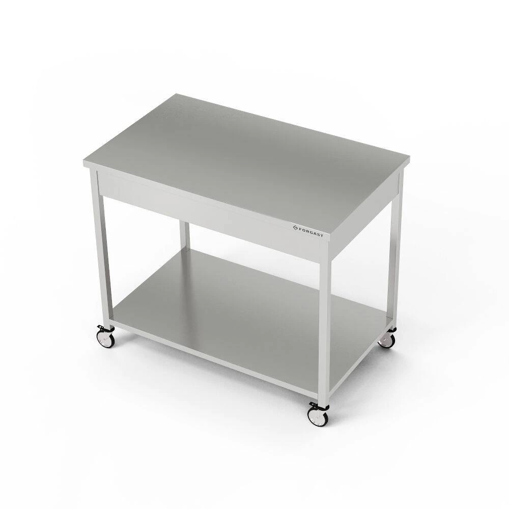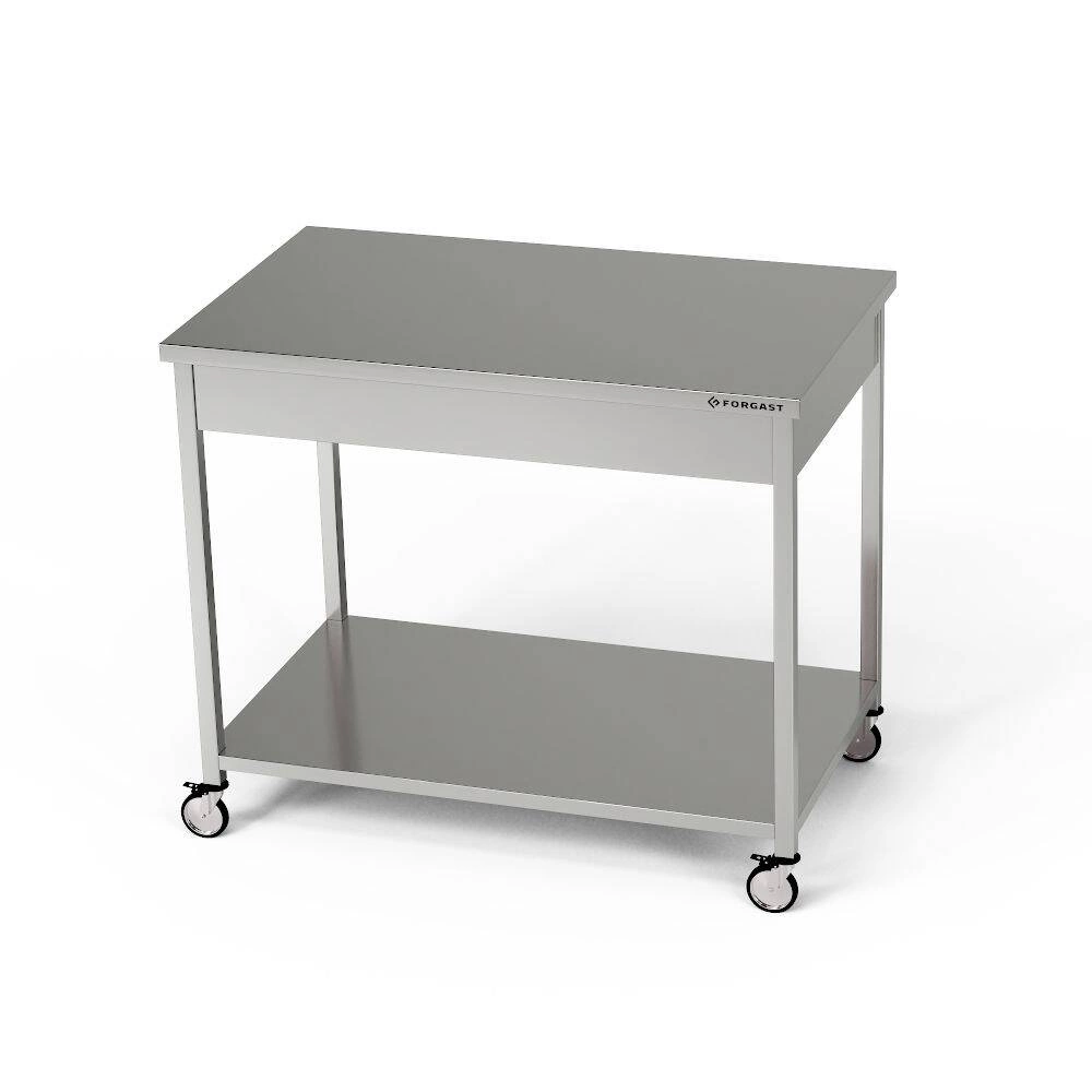 Mobilní pracovní staniceStůl se spodní pólavicí o rozměrech 80x60x85 cm je vyroben z nerezové oceli J4. Ke stolu je připevněna sada 4 brzděných cóků.