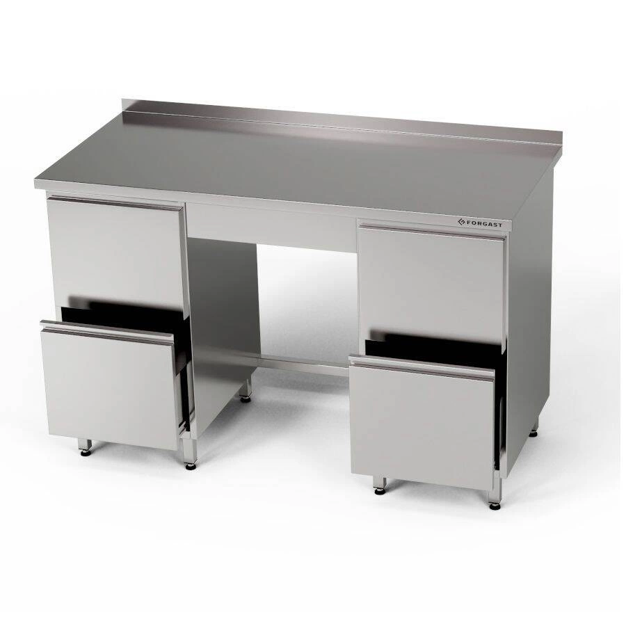 Pracovní stanice o rozměrech 140x60x85 cm se 2 bloky po 2 zásuvkách. Vyrobeno z nerezové oceli J4. Blok zásuvek umístěný na levé a pravé straně. Rozměry zásuvek v bloku se 2 zásuvkami: 44x46,5x44/18 cm.