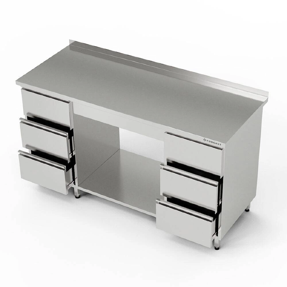 Nerezový pracovní stůl se 2 bloky po 3 zásuvkách a policí 260x60x85 cm | FORGAST