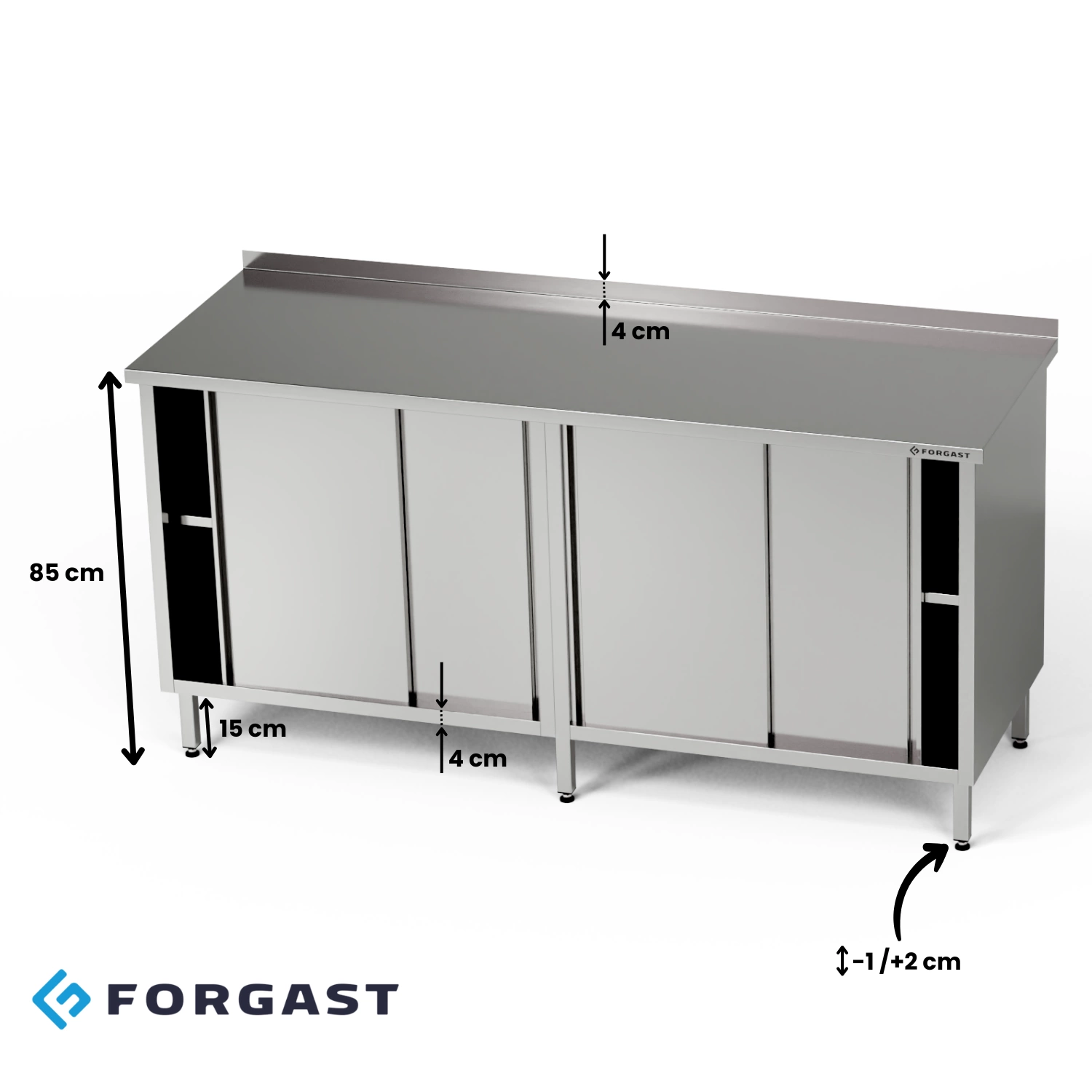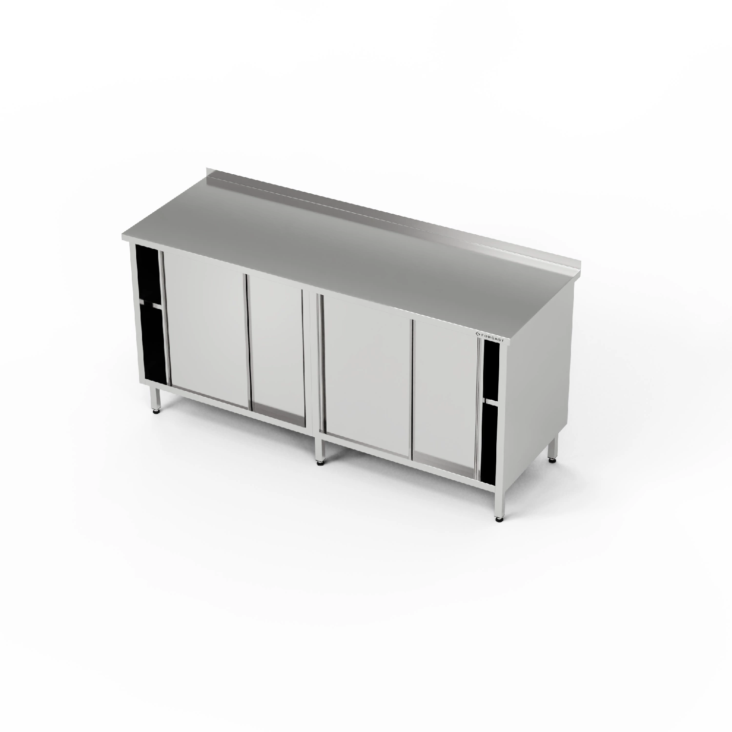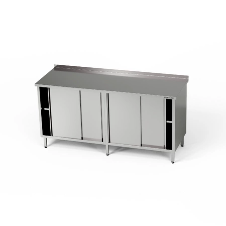 Pracovní stanice o rozměrech 210x60x85 cm se 2 skříňkami s posuvnými dveřmi z nerezové oceli J4. Uvnitř skříněk je półka.