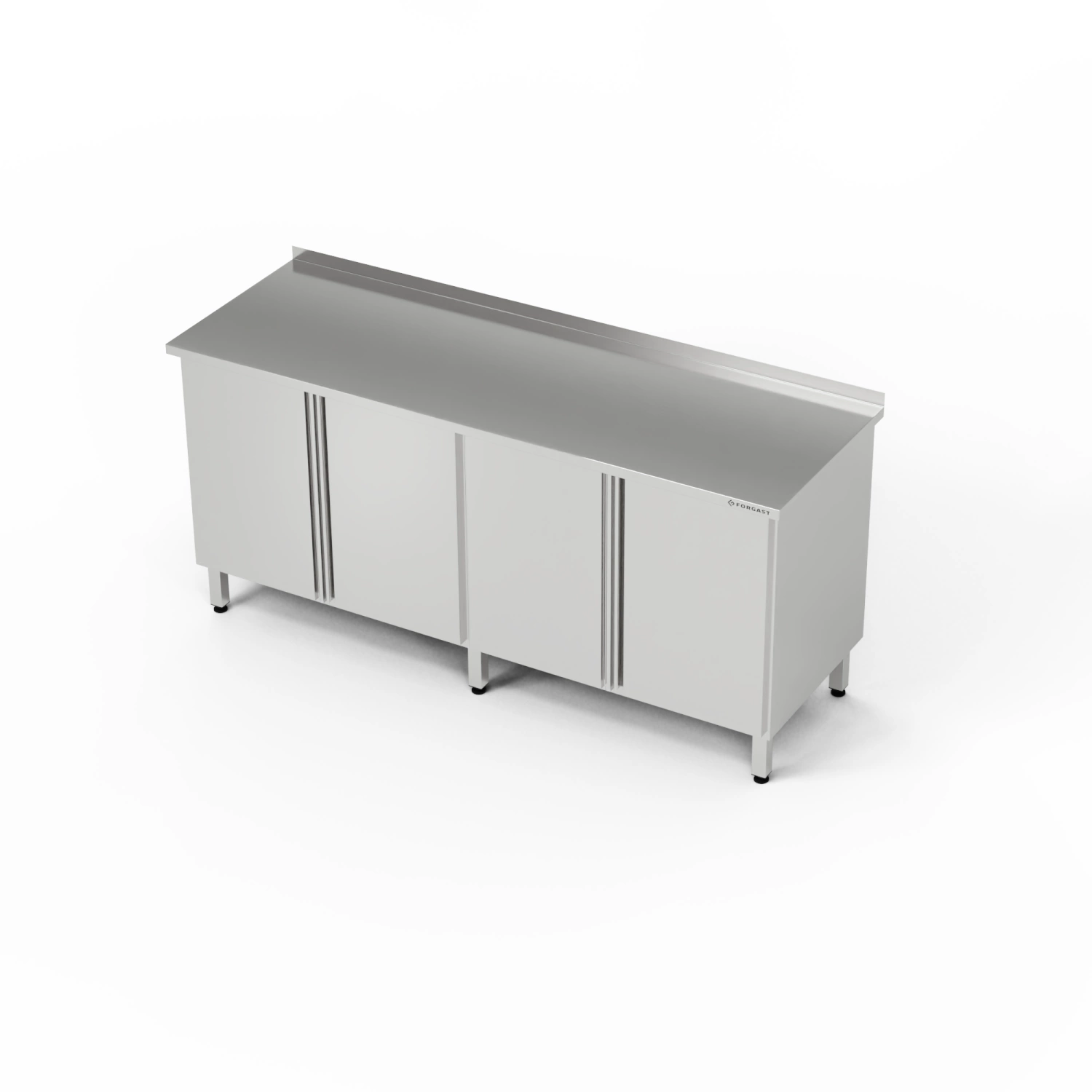 Pracovní stanice o rozměrech 280x60x85 cm se 2 skříňkami s otevíracími dvířky z nerezové oceli J4. Uvnitř skříněk je półka.