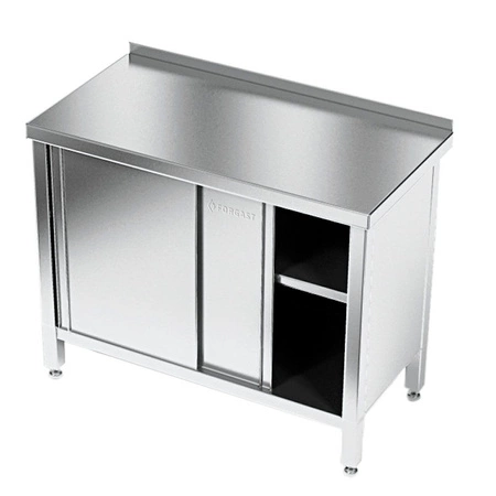Nerezový pracovní stůl se skříňkou 100x60x85 cm FORGAST je profesionální gastronomický nábytek určený pro intenzivní provoz v restauračních kuchyních, jídelnách a potravinářských provozech. Produkt se vyznačuje pevnou svařovanou konstrukcí z nerezové oceli a praktickou skříňkou s posuvnými dveřmi, která umožňuje pohodlné uložení kuchyňských doplňků a produktů. Díky použití vysoce kvalitních materiálů je stůl odolný proti vlhkosti a snadno se čistí, což je klíčové v prostředích s vysokými hygienickými nároky.