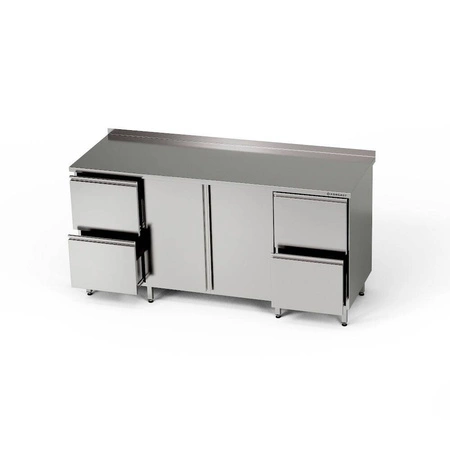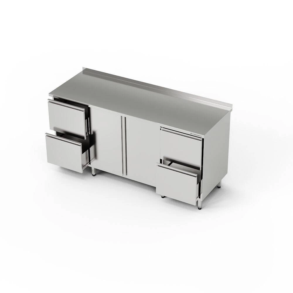 Pracovní stanice 160x70x85 cm se 2 bloky po 2 zásuvkách a skříňkou s otevíracími dvířky. Uvnitř skříňky je półka. Vyrobeno z nerezové oceli J4. Skříňka uprostřed, mezi blokem zásuvek. Rozměry zásuvek v bloku 2 zásuvek: 44x46,5x44/18 cm.