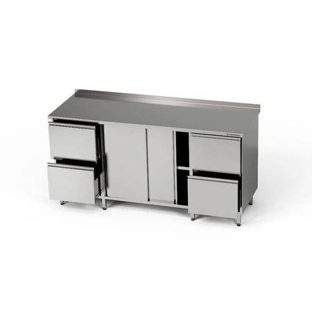 Pracovní stanice 260x70x85 cm se 2 bloky po 2 zásuvkách a skříňkou s posuvnými dveřmi. Uvnitř skříně je pólavice. Vyrobeno z nerezové oceli J4. Skříňka uprostřed, mezi blokem zásuvek. Rozměry zásuvek v bloku se 2 zásuvkami: 44x46,5x44/18 cm.