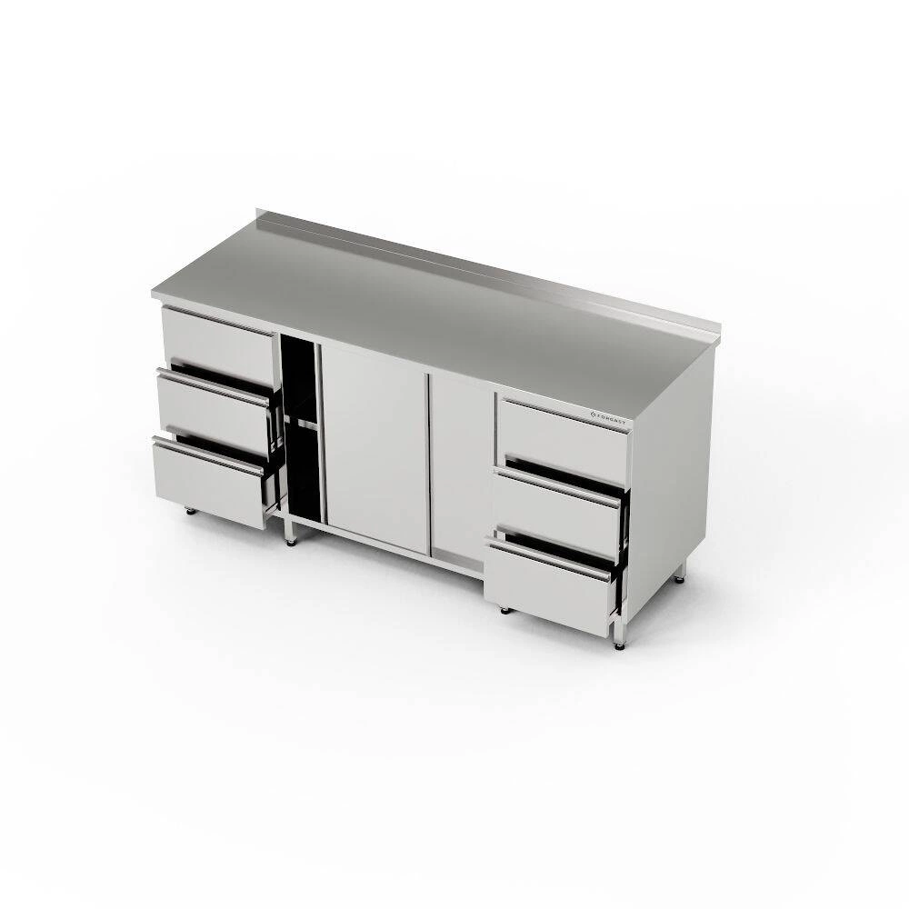 Pracovní stanice o rozměrech 200x70x85 cm se 2 bloky po 3 zásuvkách a skříňkou s posuvnými dveřmi. Uvnitř skříňky je półka. Vyrobeno z nerezové oceli J4. Skříňka uprostřed, mezi bloky zásuvek. Rozměry zásuvek v bloku 3 zásuvek: 46,5x21,5x44/13 cm.