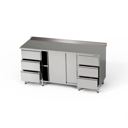 Nerezový pracovní stůl se skříňkou a 2 bloky po 3 zásuvkách 280x70x85 cm | FORGAST