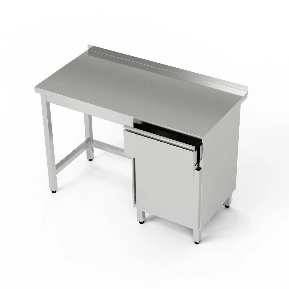 Pracovní stůl o rozměrech 150x60x85 cm se skříňkou s otevíracími dvířky a zásuvkou. Skříňka se zásuvkou dlouhou 40 cm a širokou 60 cm (hlubokou) umístěnou na pravé straně. Uvnitř skříňky je półka. Stół z nerezové oceli J4.