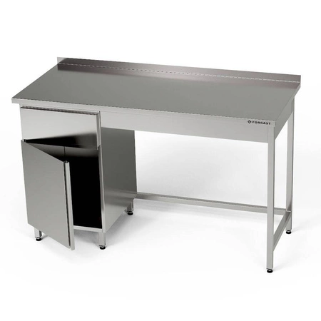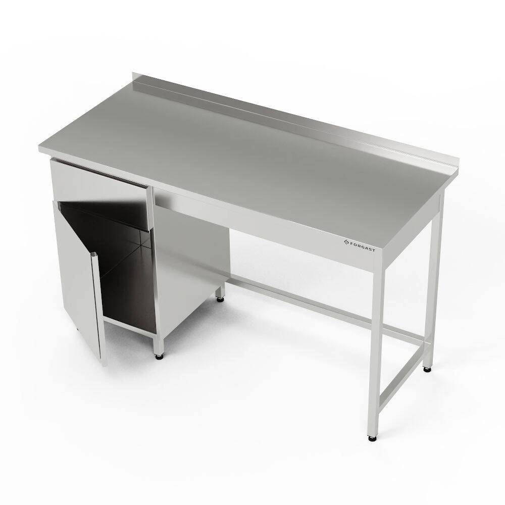 Pracovní stůl 220x70x85 cm se skříňkou s otevíracími dvířky a zásuvkou. Skříňka se zásuvkou o délce 40 cm a šířce (hloubce) 70 cm umístěná na levé straně. Uvnitř skříňky je półka. Stół z nerezové oceli J4.