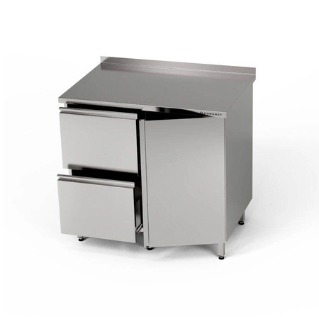 Pracovní stanice o rozměrech 80x70x85 cm s blokem 2 zásuvek a skříňkou s otevíracími dvířky. Uvnitř skříně je pólavice. Skříňka je umístěna na pravé straně. Rozměry zásuvky v bloku se 2 zásuvkami: 44x46,5x44/18 cm.
