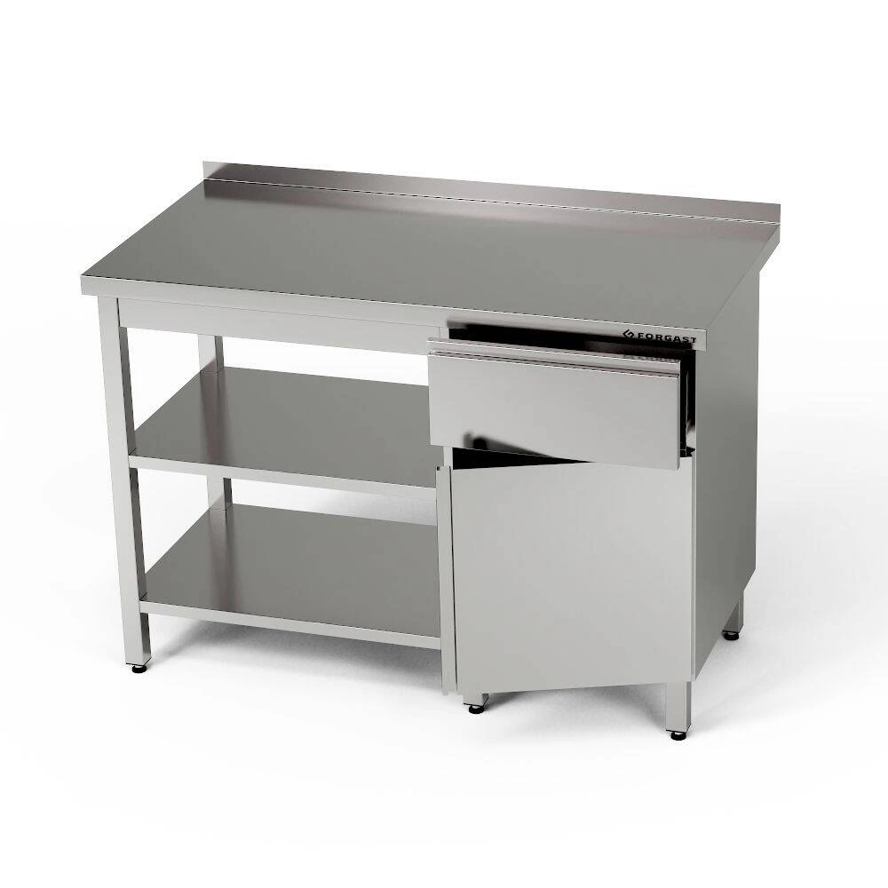Pracovní stůl o rozměrech 100x60x85 cm se skříňkou s otevíracími dvířky, zásuvkou a 2 skříňkami. Skříňka se zásuvkou dlouhou 40 cm a širokou 60 cm (hlubokou) umístěnou na pravé straně. Uvnitř skříňky je półka. Na levé straně dvě skříňky. Stół z nerezové oceli J4.