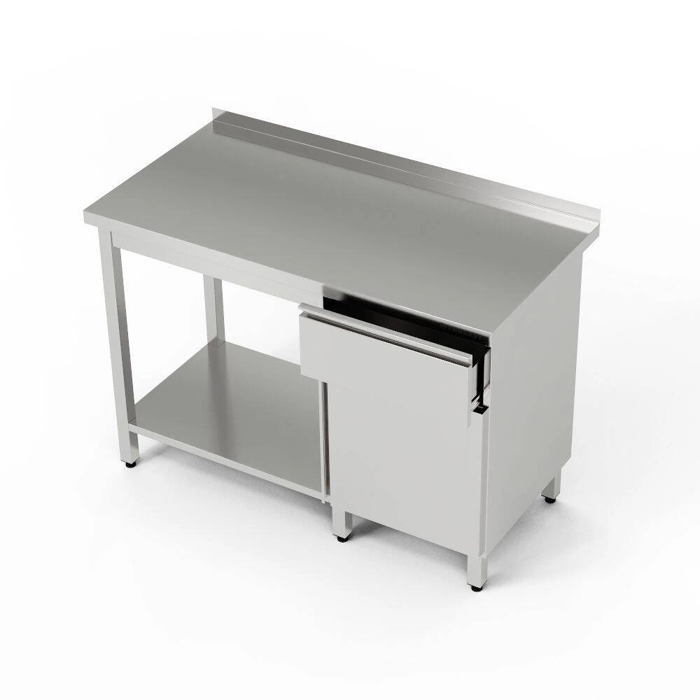 Pracovní stůl o rozměrech 210x70x85 cm se skříňkou s otevíracími dvířky, zásuvkou a pó³. Skříňka se zásuvkou dlouhou 40 cm a širokou 60 cm (hlubokou) umístěnou na pravé straně. Uvnitř skříňky je półka. Na levé straně stolu spodní skříňka. Stůl je vyroben z nerezové oceli J4.