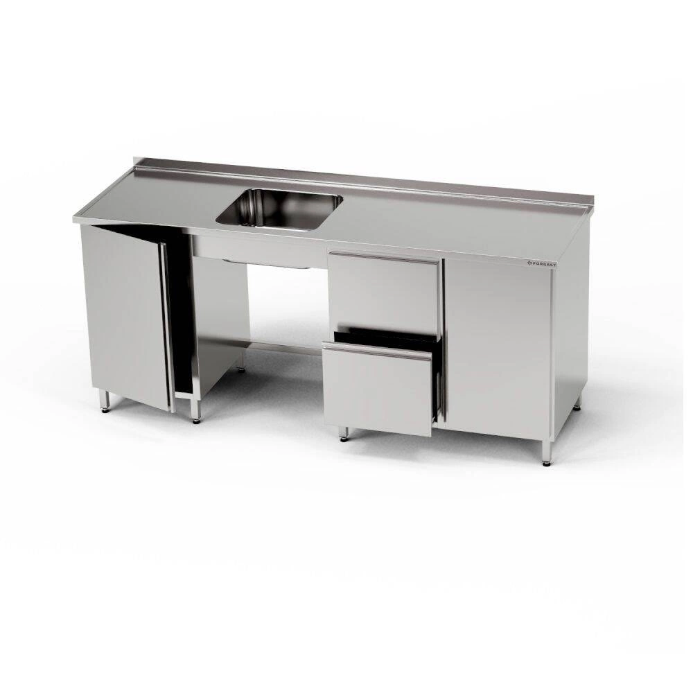 Nerezový stůl s 1-dřezem, skříňkou a blokem zásuvek je profesionální gastronomický nábytek určený pro intenzivní provoz v restauračních, hotelových kuchyních a stravovacích zařízeních. Vyniká pevnou konstrukcí z nerezové oceli, velkou pracovní plochou a praktickým rozmístěním prvků, což zajišťuje pohodlí při práci a udržení vysoké úrovně hygieny.