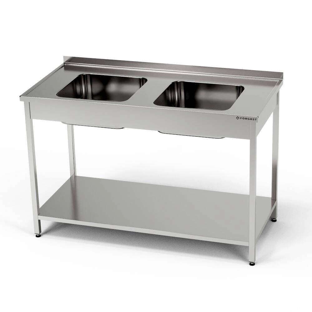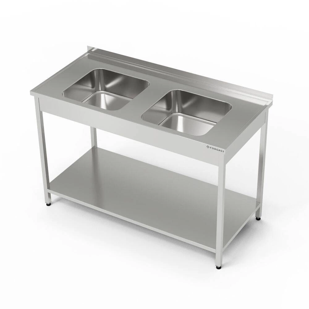 Nerezový stůl s dvoukomorovým dřezem a policí 130x70x85 cm FORGAST