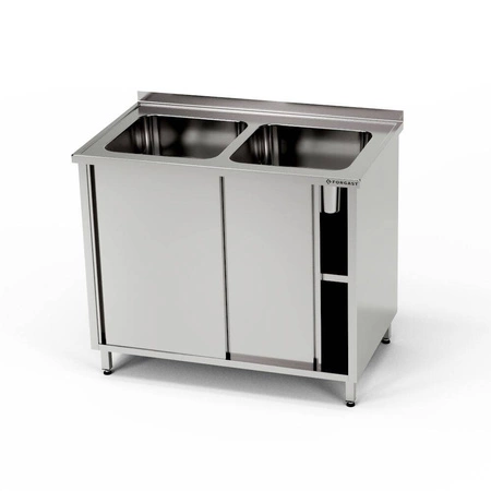 Nerezový stůl s dvoukomorovým dřezem a skříňkou je profesionální gastronomický nábytek určený pro vybavení kuchyní v restauracích, jídelnách, hotelech a dalších provozech společného stravování. Vyznačuje se dvěma prostornými komorami dřezu a uzavíratelnou skříňkou s posuvnými dveřmi, které umožňují pohodlné uložení čisticích prostředků nebo kuchyňských doplňků. Skvěle se hodí všude tam, kde je vyžadována vysoká hygiena, odolnost a funkčnost.
