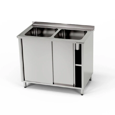 Tento model stolu najde uplatnění v restauracích, jídelnách, hotelech i v potravinářských provozech. Ideálně se hodí pro mytí zeleniny, ovoce, nádobí nebo velkých hrnců. Dvě komory dřezu umožňují současné provádění různých úkolů, což zvyšuje efektivitu práce. V sadě je kompletní stůl s dvoukomorovým dřezem, skříňka s posuvnými dveřmi a jednou policí uvnitř skříňky. Produkt je standardně vybaven otvory pro baterii a odtok, stejně jako nastavitelnými nožičkami, které umožňují stabilní umístění i na nerovném podkladu.