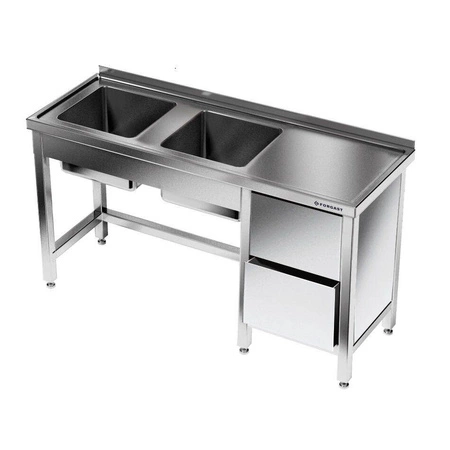 Nerezový stůl s dvoukomorovým dřezem FORGAST je profesionální kuchyňský nábytek určený pro intenzivní použití v gastronomii, potravinářských provozech nebo jídelnách. Jeho klíčové vlastnosti jsou dvě prostorné dřezové komory a praktický blok zásuvek, který zvyšuje funkčnost pracovního místa. Výrobek je vyroben z nerezové oceli, což zaručuje trvanlivost a odolnost proti korozi i při každodenním kontaktu s vodou a čisticími prostředky.