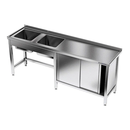 Nerezový stůl s dvoukomorovým dřezem FORGAST je ideálním řešením pro restaurace, hotely, jídelny i všude tam, kde záleží na efektivitě a hygieně práce. Umožňuje současné mytí a oplachování nádobí, přípravu zeleniny nebo mytí velkých hrnců. Díky robustní konstrukci a promyšlené ergonomii obstojí i v provozech s vysokým zatížením a skříňka s posuvnými dveřmi umožňuje bezpečné a pohodlné uložení kuchyňských doplňků.