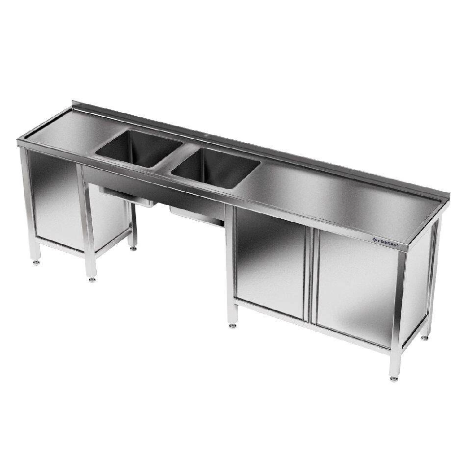 Tento stůl byl vytvořen s ohledem na intenzivní používání v profesionálních kuchyních, kde je klíčová odolnost i snadné udržení čistoty. Konstrukce na základě uzavřených profilů zajišťuje stabilitu, profilovaná deska a lemy omezují šíření vody a odpadků mimo pracovní zónu. Díky dvěma dřezům je možné současné mytí a oplachování nádobí, což výrazně urychluje práci ve velkých kuchyních. Další skříňky s otevíracími dveřmi a policemi umožňují pohodlné skladování čisticích prostředků nebo kuchyňského příslušenství.