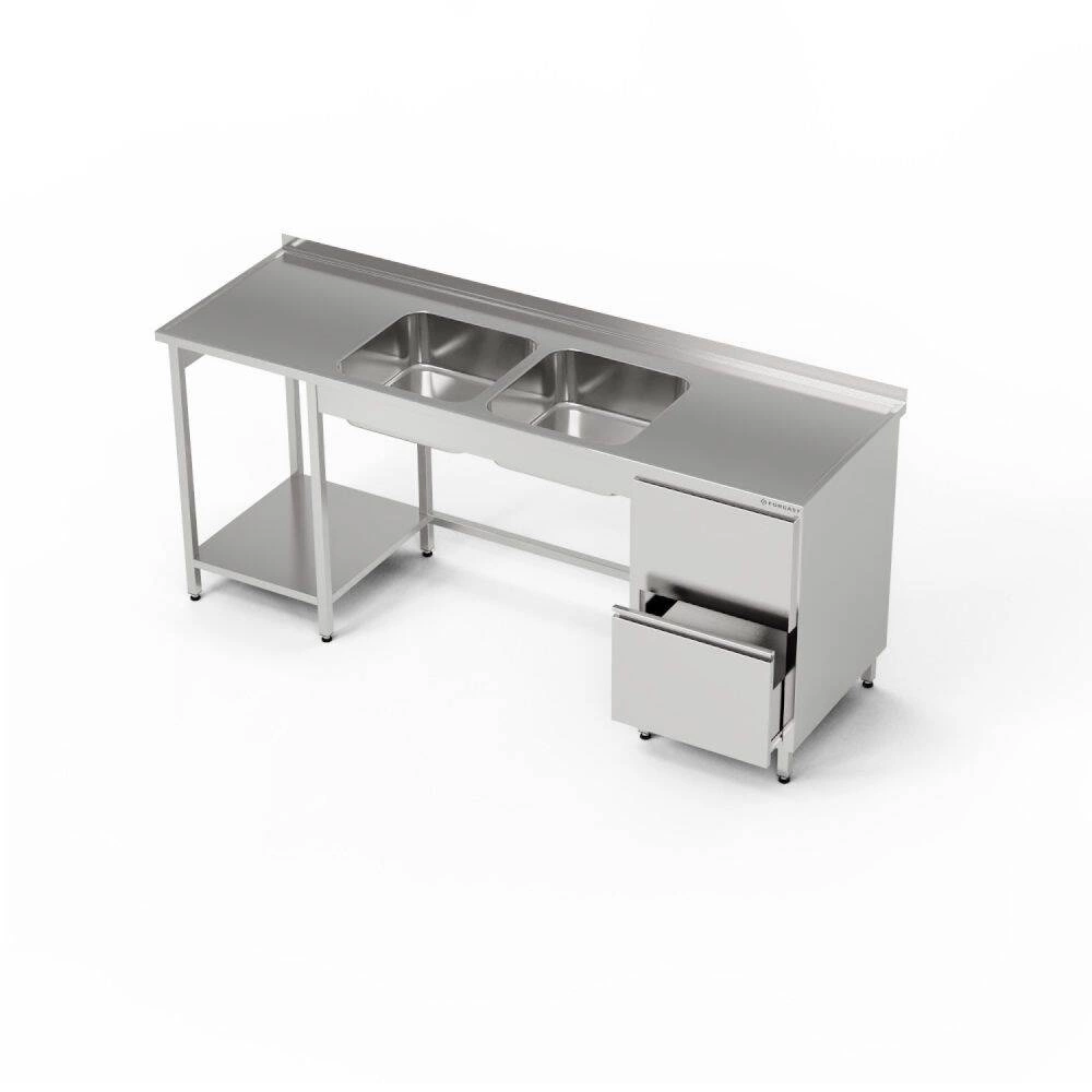 Nerezový stůl s dvoukomorovým dřezem a blokem 2 zásuvek 260x60x85 cm FORGAST