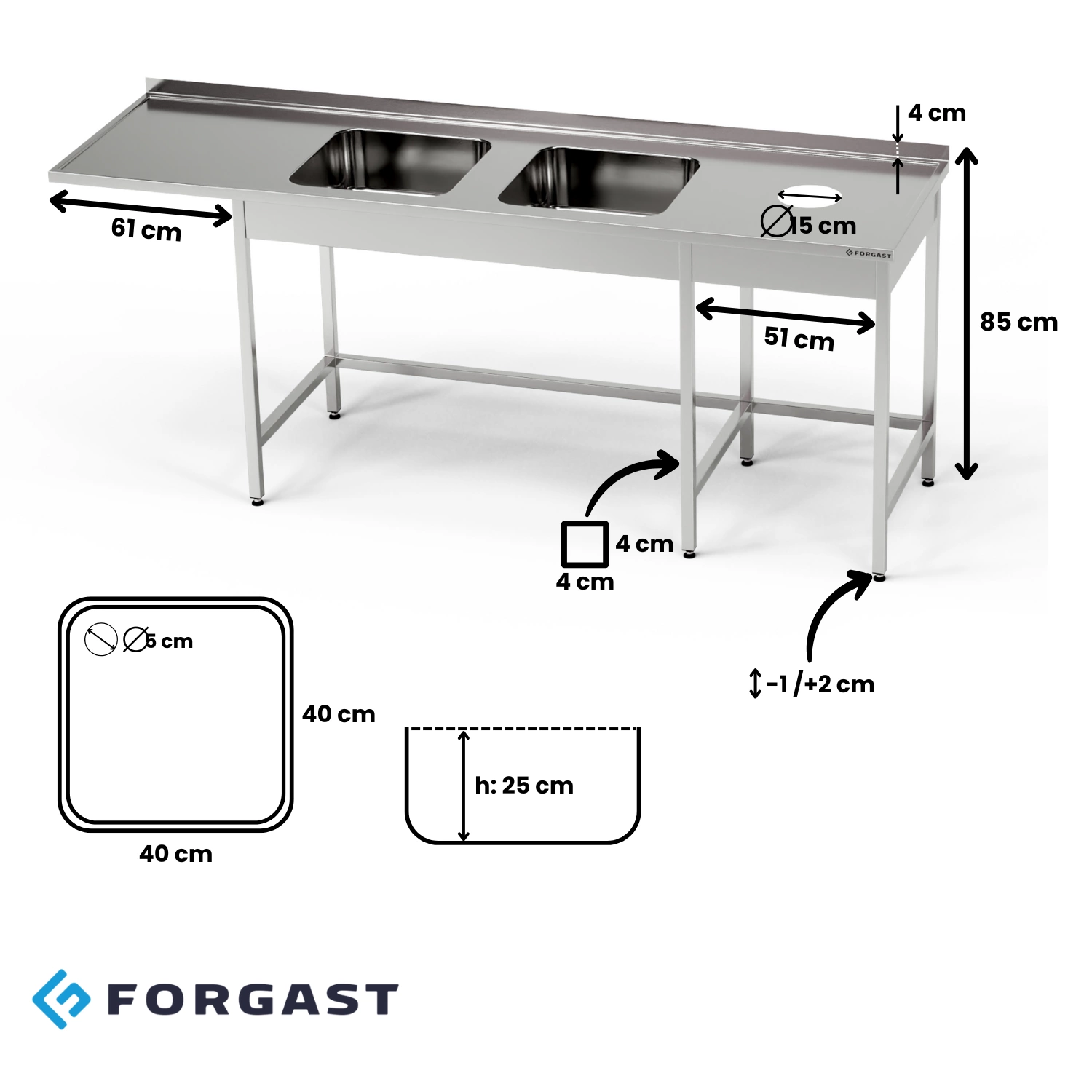 Nerezový stůl s dvoudřezem, místem na myčku a otvorem na odpadky 200x70x85 cm FORGAST