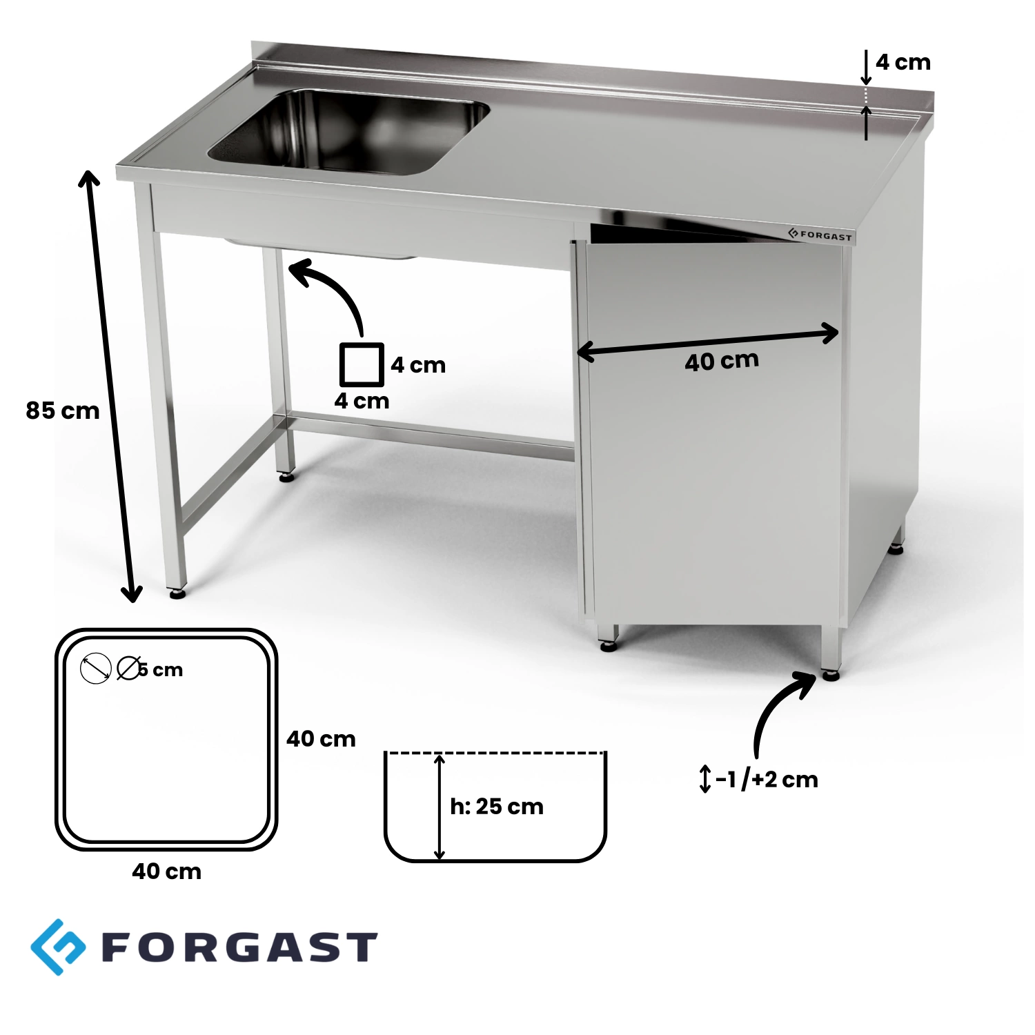 Tento model stolu najde uplatnění jak ve velkých restauracích, tak v menších gastronomických provozech či zaměstnaneckých jídelnách. Ideální pro přípravu jídel, mytí nádobí a skladování čisticích prostředků a kuchyňského vybavení. Sada obsahuje stůl s jednou dřezovou komorou a skříňkou s otevíracími dvířky. Dřezová komora může být umístěna na libovolné straně dle objednávky. Navíc je stůl vybaven otvorem pro baterii a odtok, což umožňuje rychlou instalaci armatury.