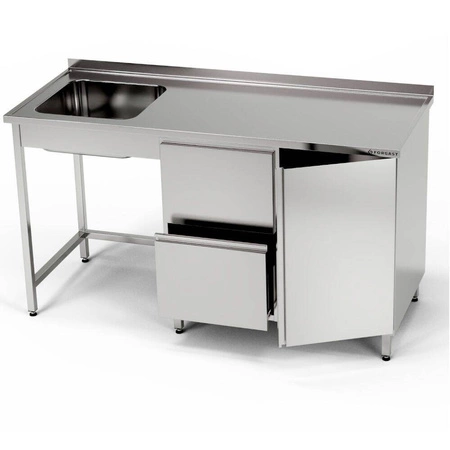 Stůl je vybaven jednou dřezovou komorou s velkou kapacitou, což umožňuje pohodlné mytí velkého nádobí a hrnců v profesionálních kuchyních. Dřez lze namontovat vlevo nebo vpravo na pracovní desce, díky čemuž lze nábytek snadno přizpůsobit konkrétnímu uspořádání prostoru. Na opačné straně je praktická skříňka s otevíracími dvířky a policí, která umožňuje uložení detergentů, čisticích prostředků nebo většího kuchyňského příslušenství. Navíc blok dvou zásuvek poskytuje rychlý přístup k nejčastěji používaným pomůckám, jako jsou nože, lžíce nebo drobné kuchyňské nástroje. Konstrukce stolu je zesílena zadním lemem o výšce 4 cm, který chrání stěnu před znečištěním a stékající vodou.