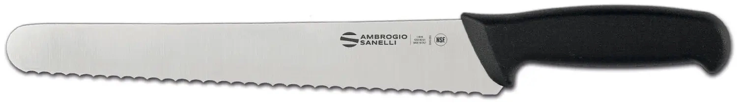 Nůž na dort Supra od Ambrogia Sanelliho je profesionální nástroj určený k přesnému a estetickému krájení dortů, zákusků a pečiva. Je vybaven vroubkovaným, zkoseným ostřím a ergonomickou rukojetí a splňuje očekávání každého cukráře.