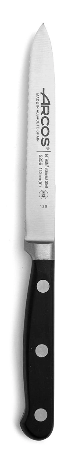 Nůž na rajčata ze série ÓPERA od společnosti Arcos je přesný nástroj určený ke krájení jemné zeleniny a ovoce, například rajčat. Tento nůž je vybaven vroubkovanou čepelí, která si dokonale poradí s tvrdou slupkou ovoce a zároveň zachová neporušený jemný vnitřek. Čepel je vyrobena z inovativní nerezové oceli NITRUM®, která zajišťuje zvýšenou tvrdost a odolnost proti korozi, což má za následek dlouhou životnost a spolehlivost nástroje. Díky hedvábnému ostří poskytuje nůž výjimečnou přesnost řezu a pohodlná a dokonale vyvážená rukojeť z odolného materiálu POM zaručuje pohodlí při práci. Rukojeť, která je se střenkou spojena nýty z nerezové oceli, dále zpevňuje konstrukci nože a profilování chránící prsty zvyšuje bezpečnost při používání.
