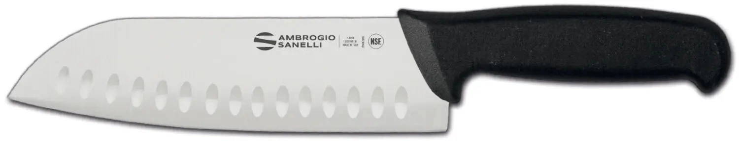 Nůž Supra Santoku od Ambrogia Sanelliho je ideálním nástrojem pro profesionální kuchaře a je ideální pro krájení, sekání a porcování surovin. Díky drážkovanému noži a ergonomické rukojeti nabízí snadné použití a dokonalé výsledky v každé kuchyni.