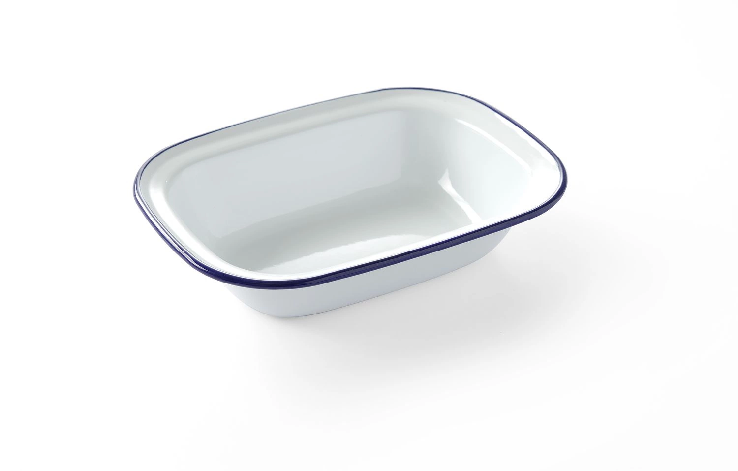 Obdélníková miska 21,5x16 cm. . Vyrobeno z vysoce kvalitní oceli potažené bílým smaltem s modrým okrajem. Možnost stohování, lze mýt v myčce nádobí. Nevhodné pro použití v mikrovlnné troubě.
