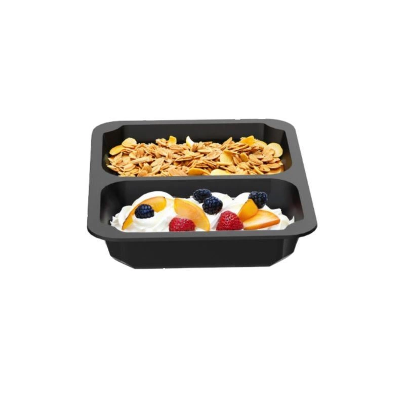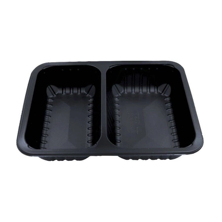 Obědová nádoba se 2 přihrádkami o rozměrech 22,7x17,8x5 cm na jídlo s sebou. Nádoba je vyrobena z černého recyklovatelného polypropylenu. Určeno pro uzavírání jídla s sebou v uzavíracích strojích.
