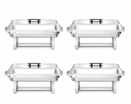 Kompletní sada: Obsahuje 4 ohřívače, každý s nádobou GN 1/1 o hloubce 65 mm, podstavcem pro stojan, stojanem, nádobou na vodu (555 mm × 350 mm) a víkem.
