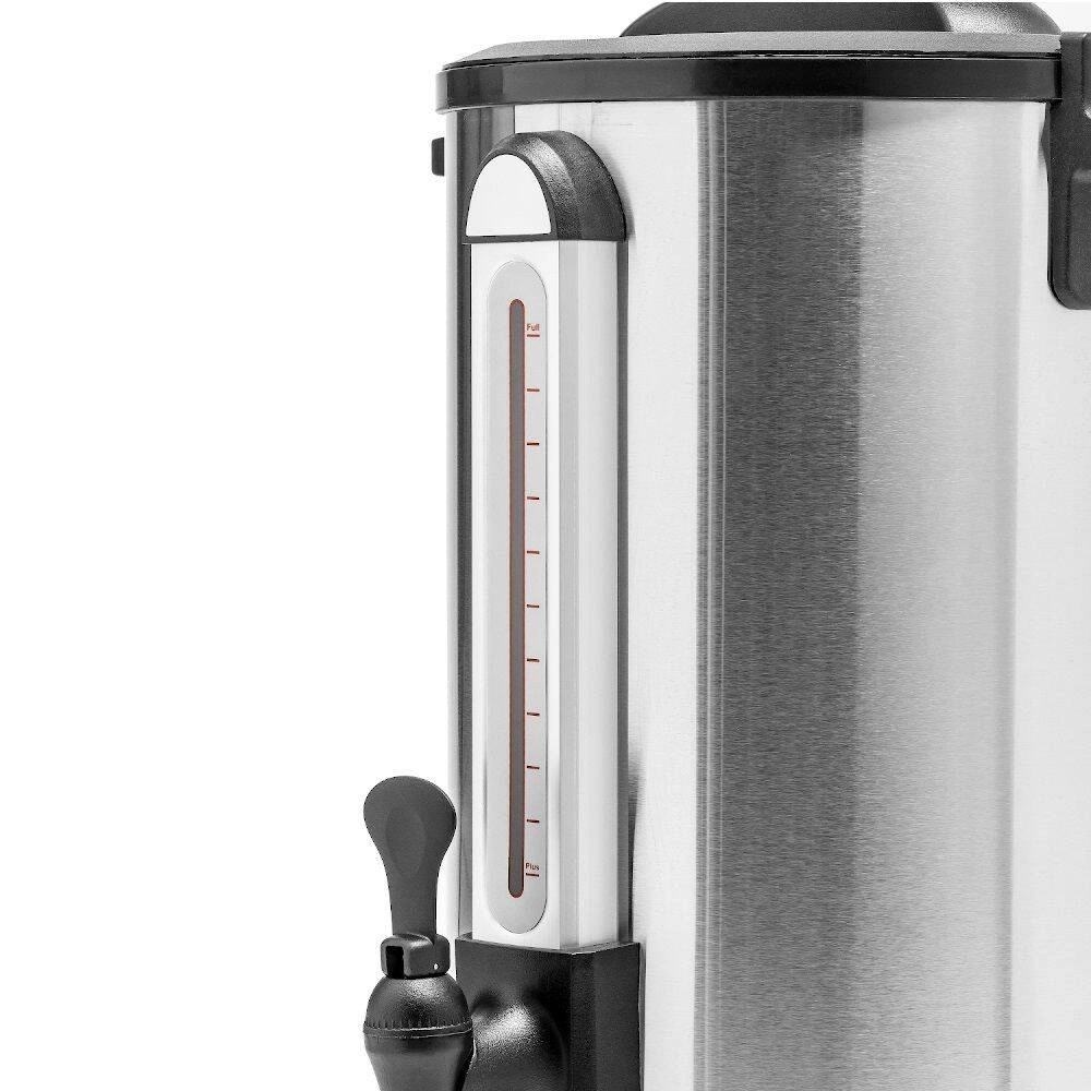 • Přehledný ukazatel hladiny vody a nekapkající kohoutek: Usnadňují kontrolu množství vody a servírování nápojů bez rizika rozlití, což je zvláště důležité na místech s intenzivním provozem.