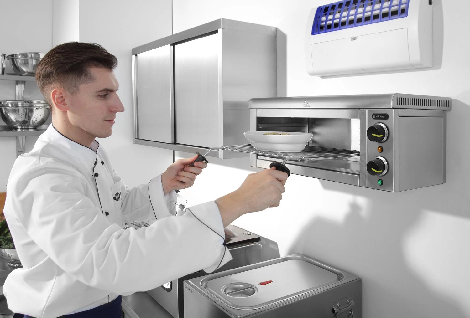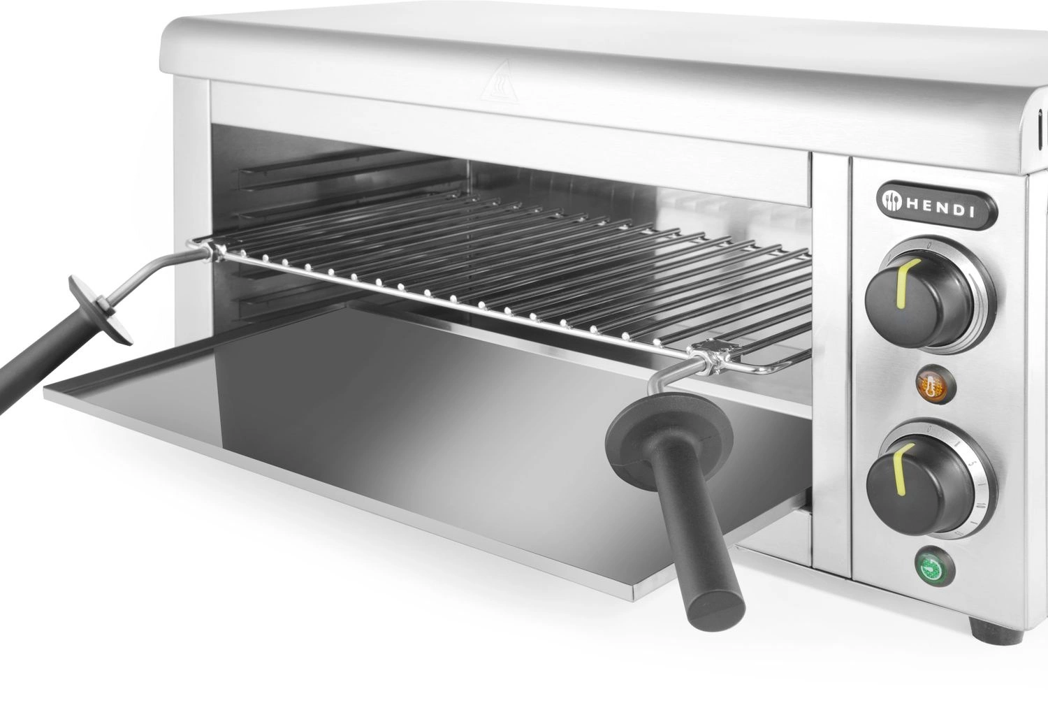 Elektrický opékač HENDI 264119 je zařízení vytvořené s ohledem na profesionální gastronomické využití. Pevná konstrukce a snadná montáž na stěnu umožňují použití všude tam, kde je důležitá ergonomie a rychlý přístup k zařízení. Komora opékače má čtyři úrovně nastavení roštu s izolovanými rukojeťmi, což umožňuje přesné přizpůsobení pracovních podmínek typu pokrmu. Topné těleso umístěné v horní části komory zajišťuje optimální výsledky opékání, zatímco termostat a časovač zvyšují pohodlí a bezpečnost při používání. Vysoké krytí (IPX4) zaručuje bezpečný provoz i ve vlhkých kuchyňských podmínkách. Součástí balení je také tác na drobky, který usnadňuje udržování zařízení v čistotě.