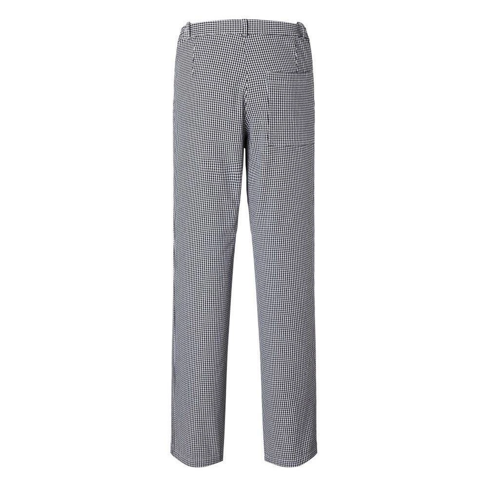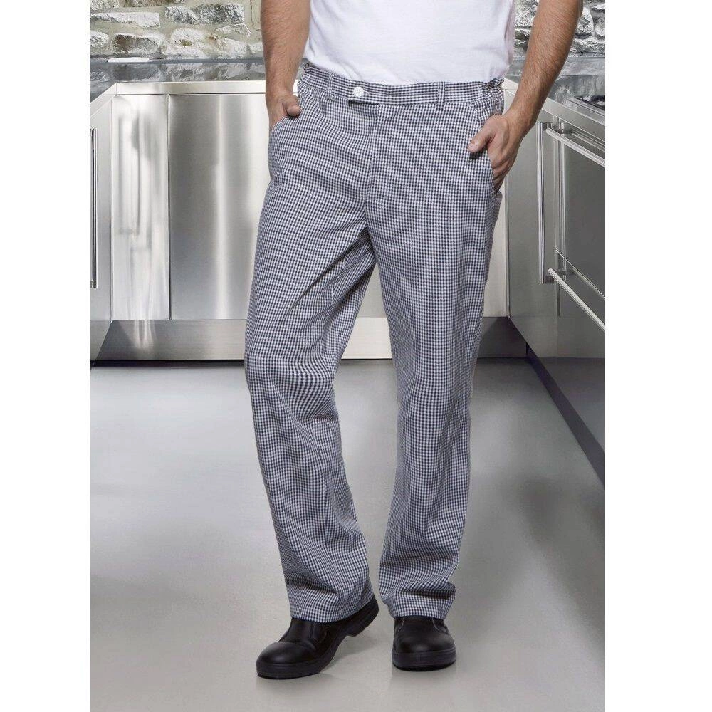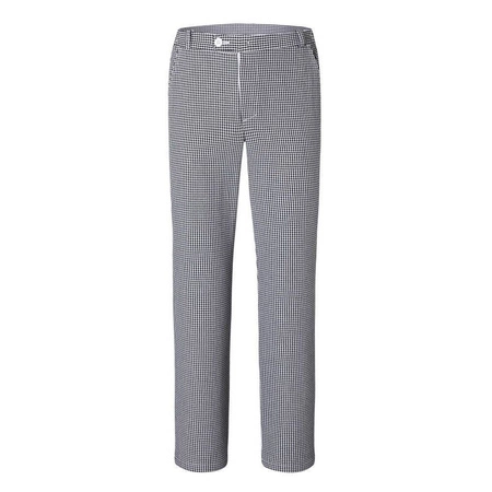 Základní kuchařské kalhoty Karlowsky. Černá barva, kostkovaný vzorór. Vyrobeno ze 100% bavlny 245 g/m2. . Keprová vazba. Kalhoty mají pravidelný lem se záhyby. V pase na bocích prošitá guma. Kapsy na každé straně a 1 kapsa na pravé zadní straně. V pase poutka na pásek. Lze prát a žehlit. Nesmí se bělit. Kalhoty jsou k dispozici ve velikostech S až 3XL.