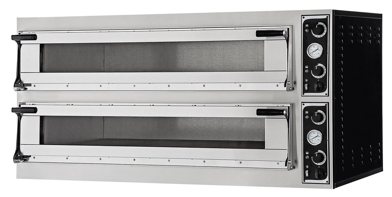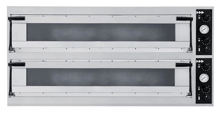 TÁCKY SKLO L pizza pec;pro plechy na cukrovinky a pečivo o rozměrech 60x40 cm. Díky své velké flexibilitě díky mimořádně velké komoře je vhodná nejen pro typické pizzerie, ale také pro cukrárny a pekárny, kde můžete péct různá těsta přímo na plechách o rozměrech 600x400 mm.  Přední část přístroje je vyrobena z nerezové oceli,  zatímco kryt je vyroben z černě lakované oceli. Dveře s velkým prosklením pro snadné pozorování procesu pečení. Dvě madla na každé dveře. Izolace z minerální vlny. Nezávislé osvětlení pro každou komoru. Topná tělesa 1,15 kW nebo 1,7 kW, v sadách po 3 pro každou komoru. Nastavení topných těles pomocí nezávislých termostatůópro každou komoru;