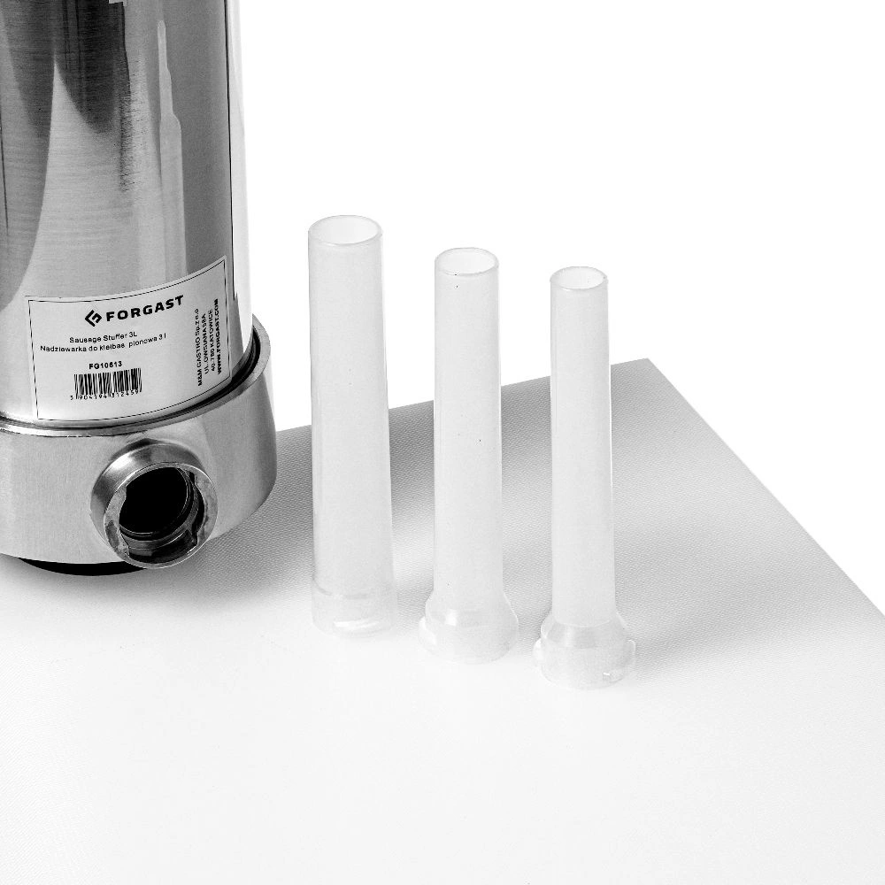 Nástavec FORGAST FG10613 byl navržen s ohledem na odolnost a funkčnost. Pevná nerezová ocel nejen zajišťuje odolnost proti mechanickému poškození, ale také usnadňuje udržování zařízení v čistotě. V sadě se nacházejí tři plastové nástavce o různých průměrech – 18, 20 a 22 mm – což umožňuje přípravu jak tenkých, tak i silnějších klobás. Přiložené nástavce umožňují přizpůsobení zařízení různým druhům náplní a střívek, což je zvláště užitečné v kuchyních s širokým sortimentem.