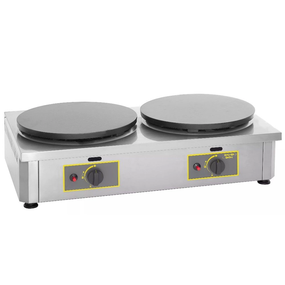 Dvojitá plynová palačinkovač ROLLER GRILL CDG 350 je profesionální gastronomické zařízení určené pro přípravu palačinek a placek ve velkém množství. Její největší předností jsou dvě nezávislé plotny o průměru 35 cm každá a možnost napájení LPG nebo zemním plynem NG. Zařízení se skvěle hodí do cukráren, palačinkáren, hotelových bufetů i na venkovní akce.