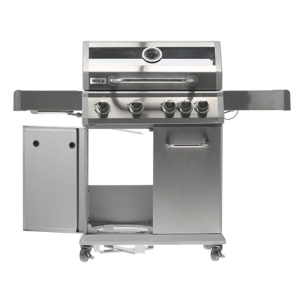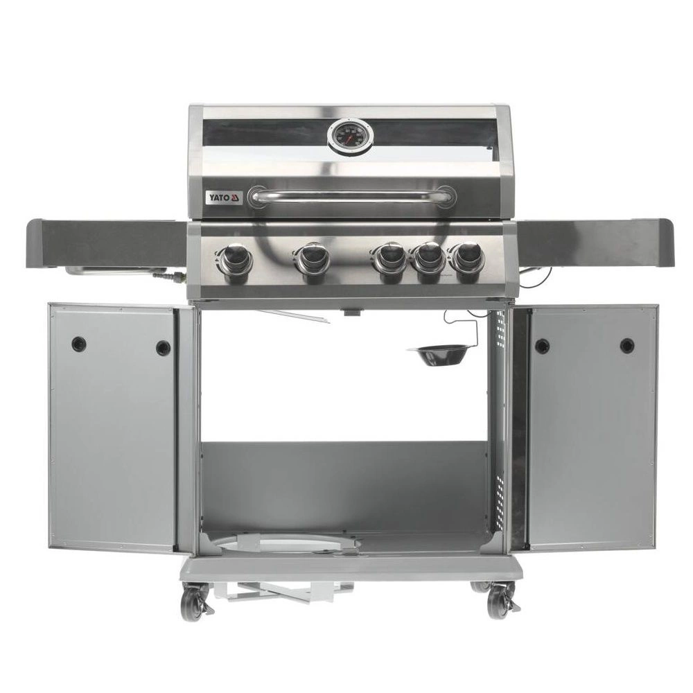 Plynový gril 4+1 značky YATO o rozměrech 133x57x112 cm vyrobený z vysoce kvalitní nerezové oceli. Ústředním prvkem grilu je rychle se zahřívající žebrovaný litinový rošt o rozměrech 70x41,5 cm – 3 rošty: 22,5x41,5 cm (2 ks), 22x41,5 cm (1 ks), který dlouho udržuje teplo. Navíc gril obsahuje vyjímatelný kulatý rošt o průměru 30 cm, zabudovaný v hlavním roštu. Tento prvek lze snadno nahradit pizza kamenem (není součástí sady), což rozšiřuje možnosti grilu. Pohodlí při používání zajišťují boční police a prostorná uzavíratelná skříňka, které usnadňují skladování potřebného příslušenství, koření a dalšího vybavení. Další boční hořák o výkonu 2,2 kW otevírá nové možnosti, umožňuje vaření a ohřívání jídel v hrnci nebo na pánvi. Výhodou je místo na 11l českou plynovou láhev, nerezová nádoba umístěná v jedné z bočních polic a vestavěný otvírák na lahve.