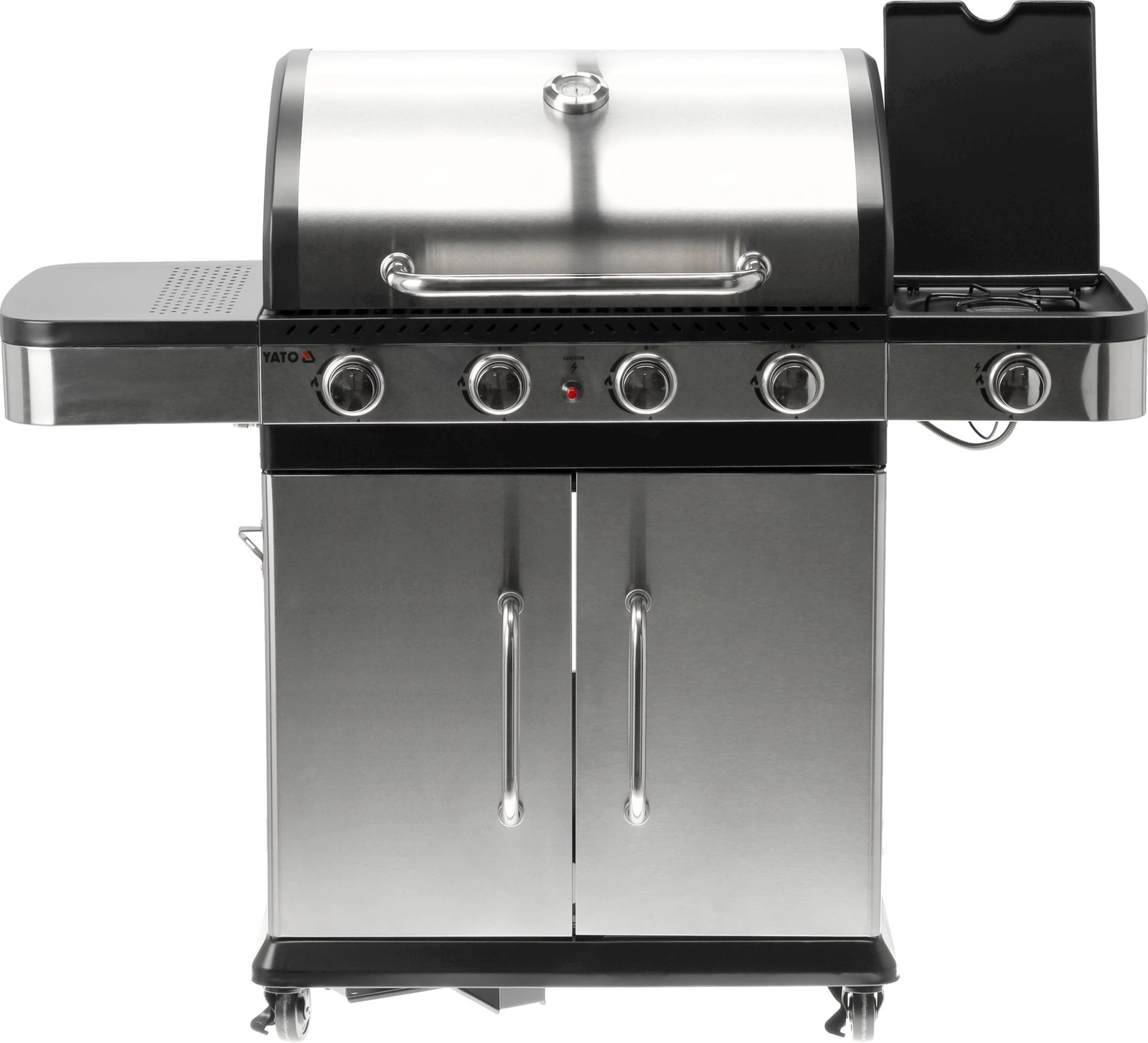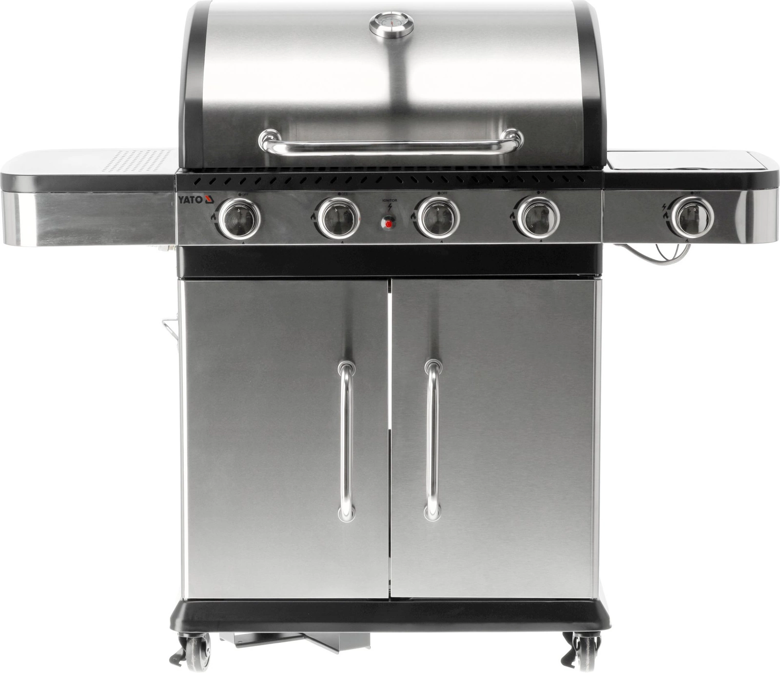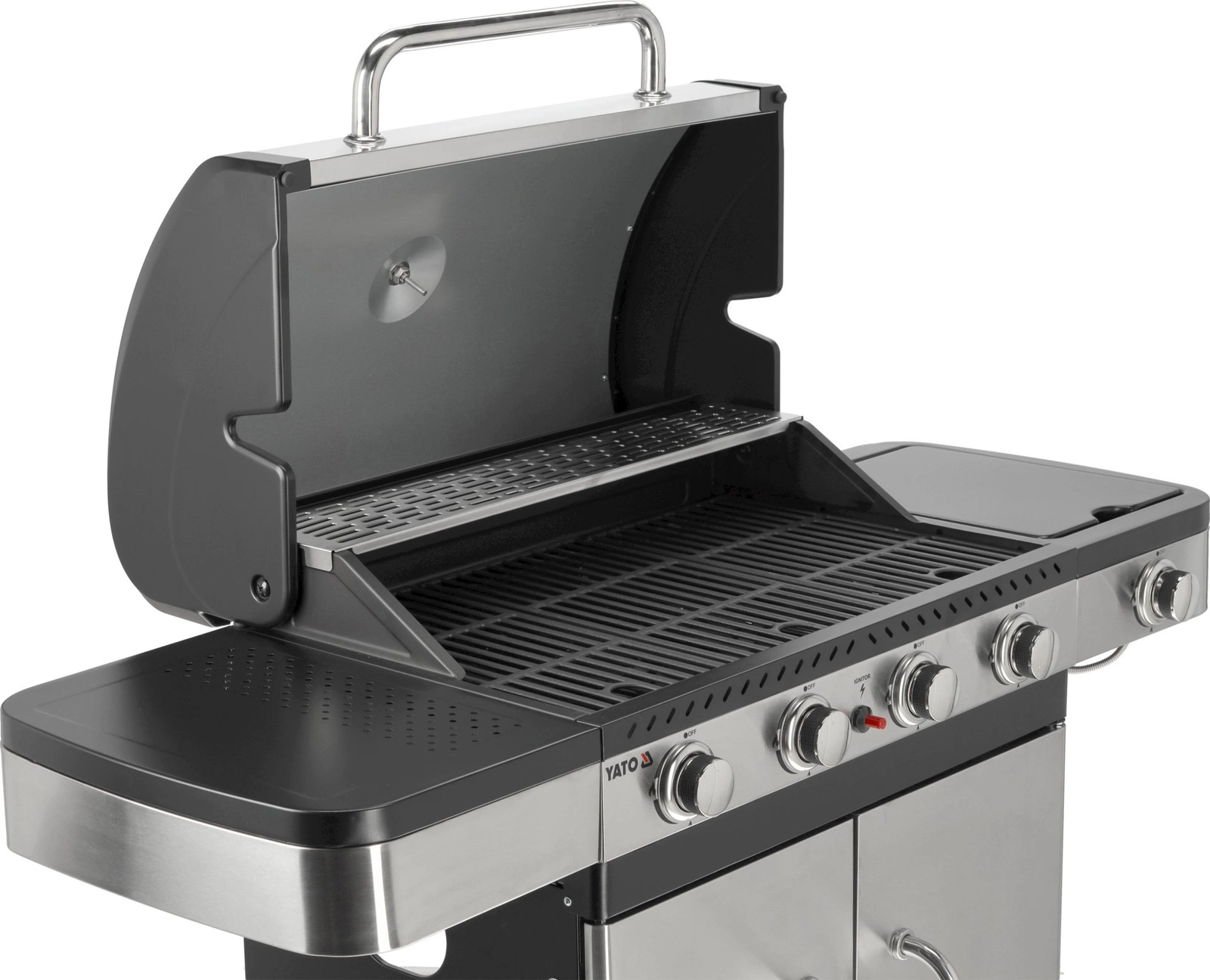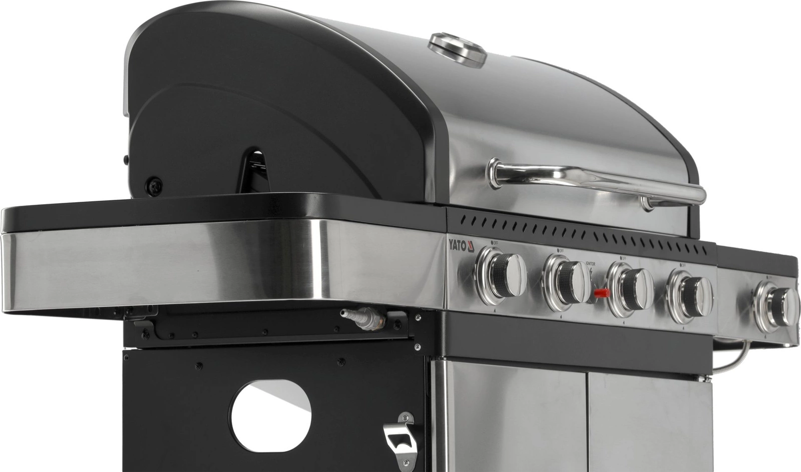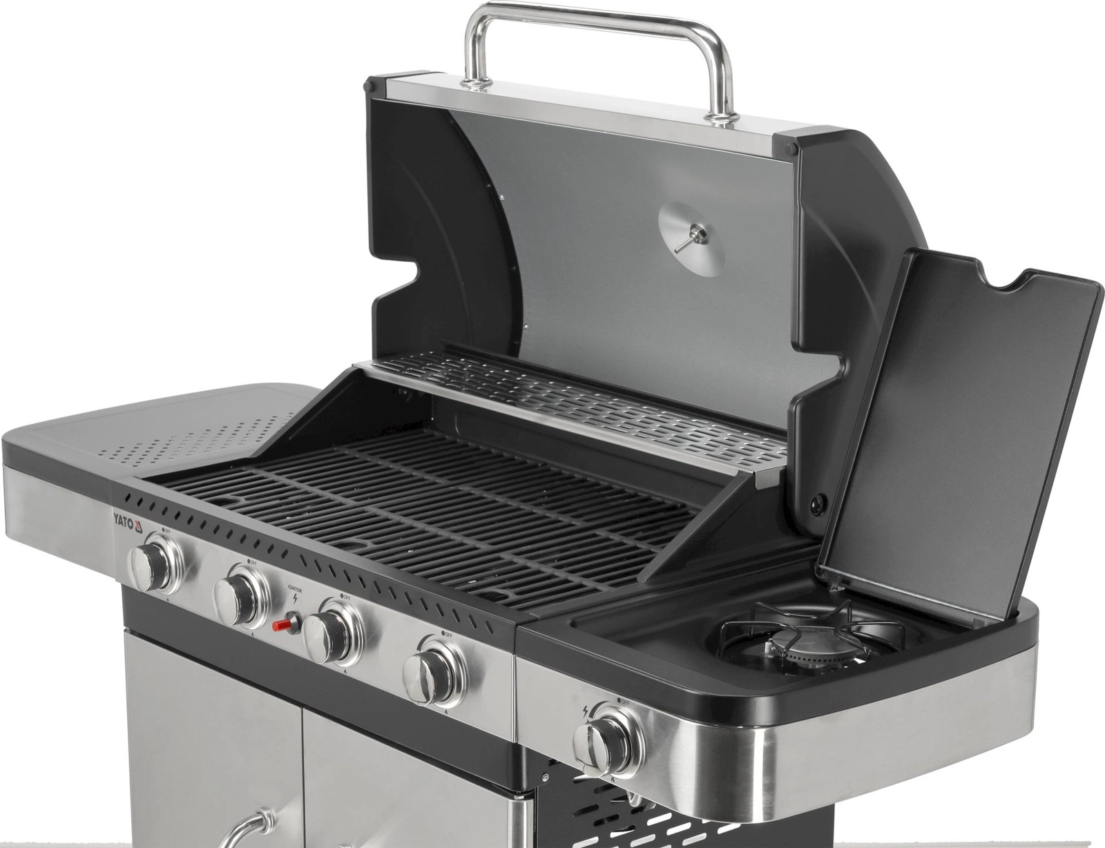 Plynový gril 4+1 Yato YG-20019 s elegantním designem, vyrobený z vysoce kvalitní nerezové oceli, má odolný litinový rošt.