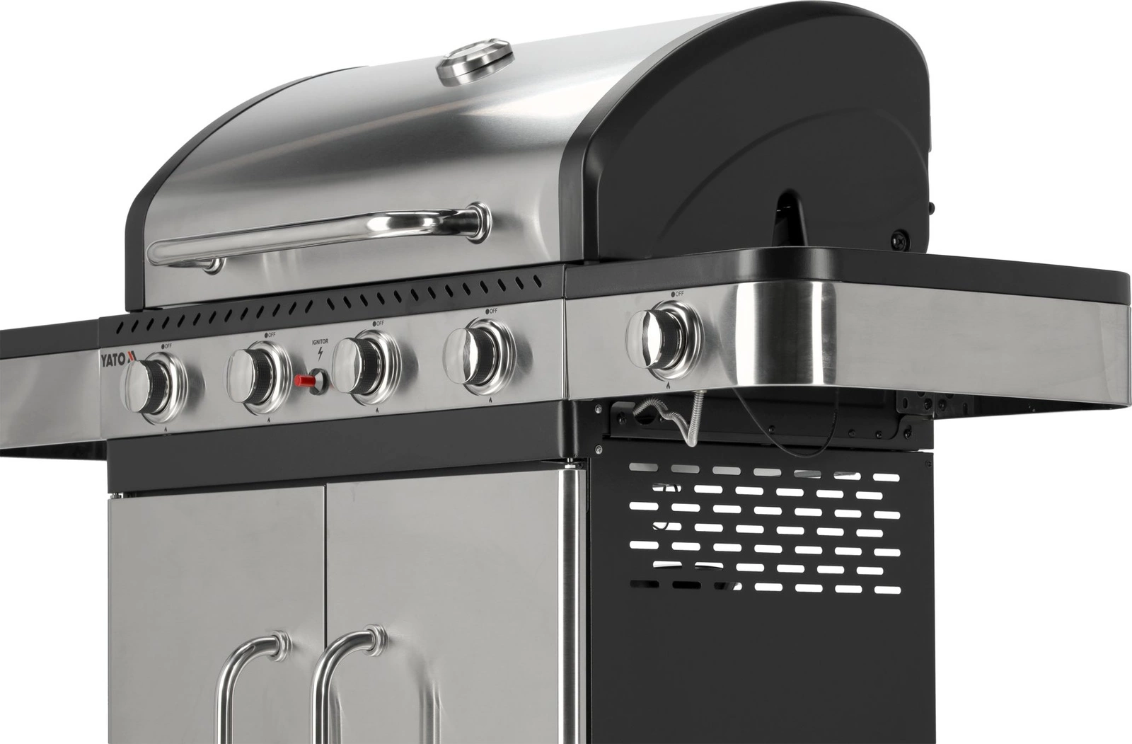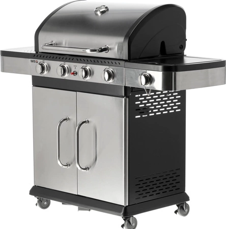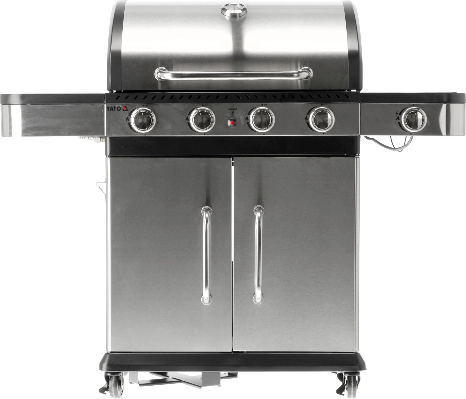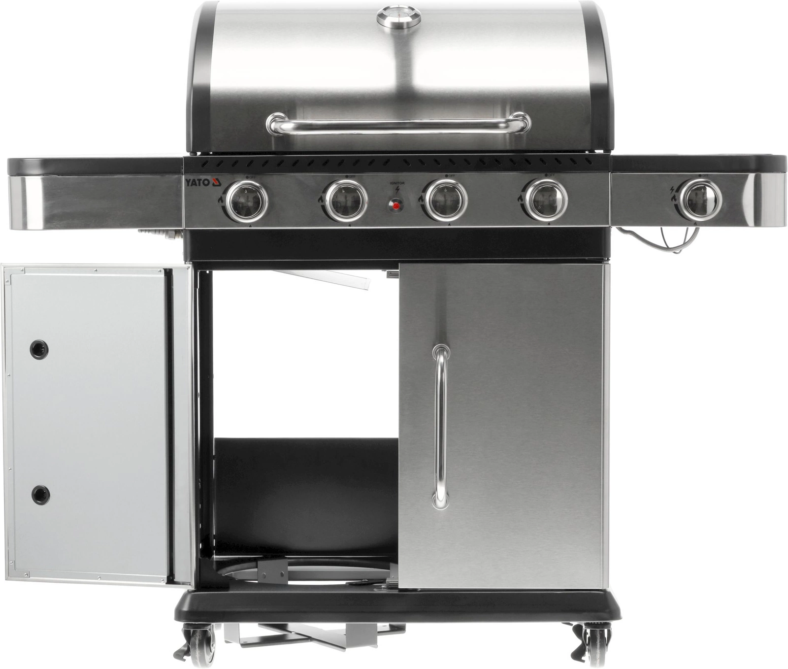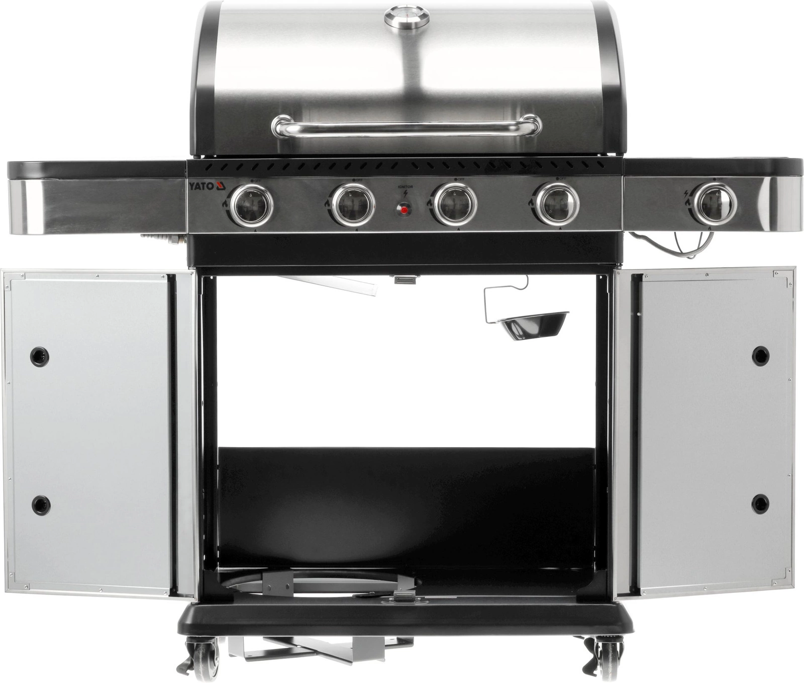 Plynový gril 4+1 Yato YG-20019 s elegantním designem, vyrobený z vysoce kvalitní nerezové oceli, má odolný litinový rošt.