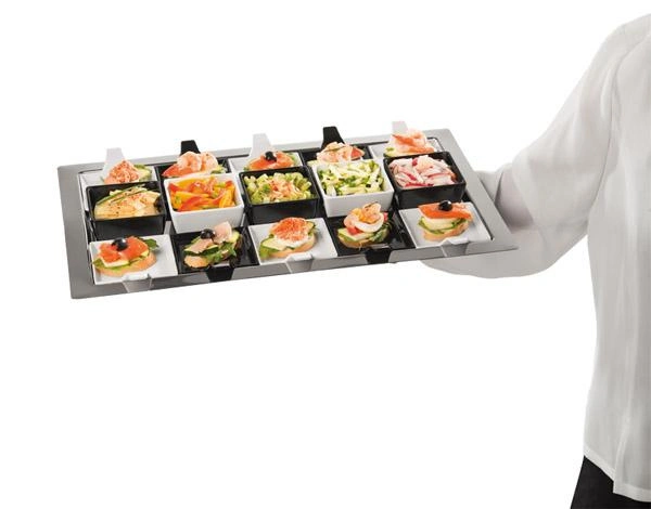 - Nízký okraj – výška tácu umožňuje pohodlné servírování a nabírání jídel, zároveň brání jejich posouvání při přenášení.