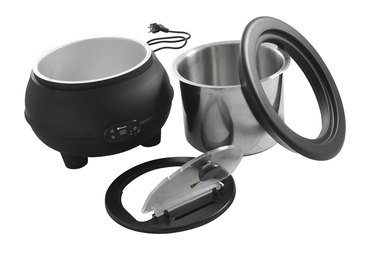 Kotel je vybaven digitálním ovládacím panelem s displejem, na kterém se střídavě zobrazuje nastavená teplota a aktuální teplota polévky. Přístroj má termostat s ochranou proti přehřátí - pokud je hladina vody v nádobě příliš nízká, rozsvítí se červená kontrolka a zazní zvukový signál.