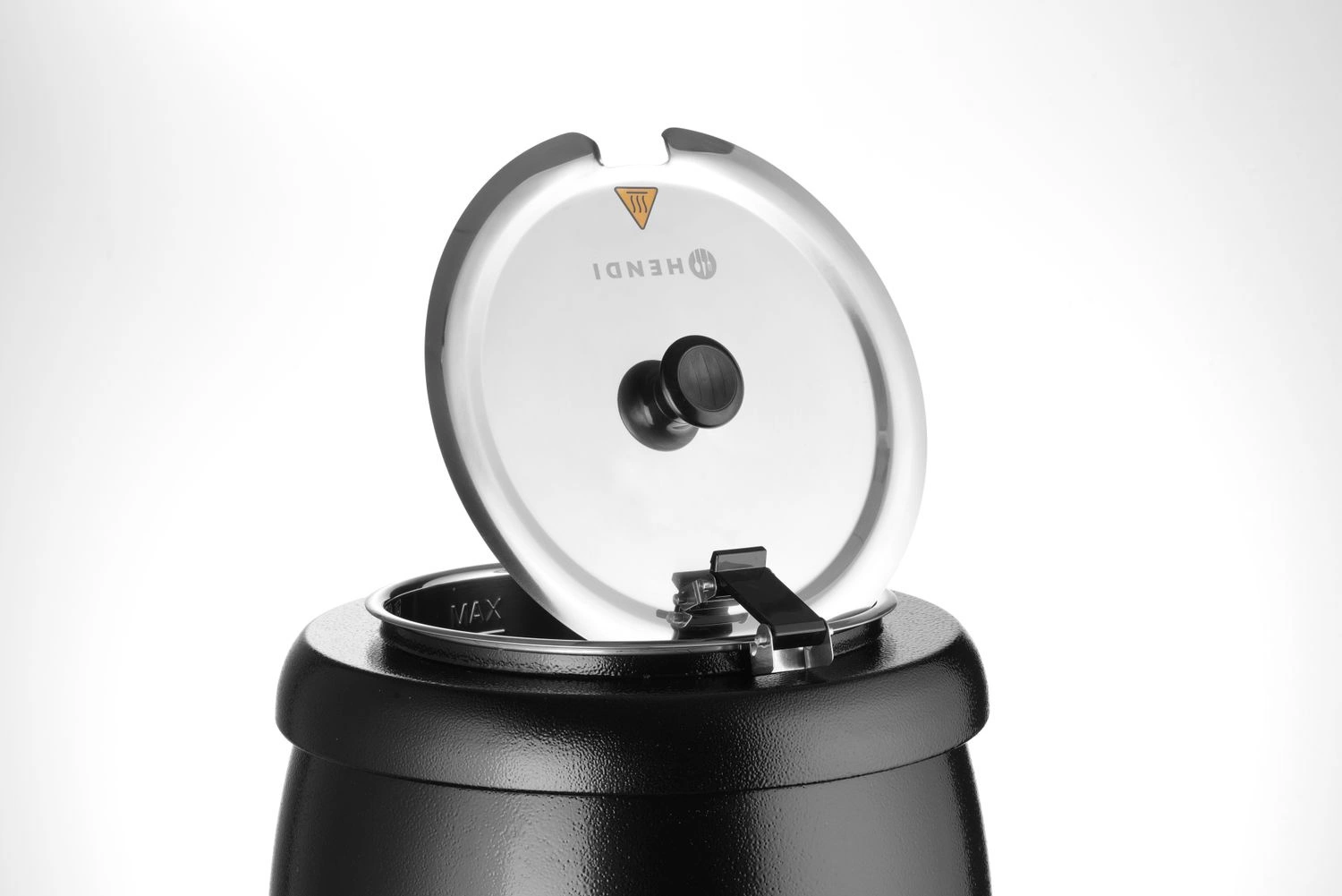Elektrická konvice na polévku Ideální pro bufet. Kryt z černě lakované oceli. Víko a nádoba na polévku z nerezové oceli.