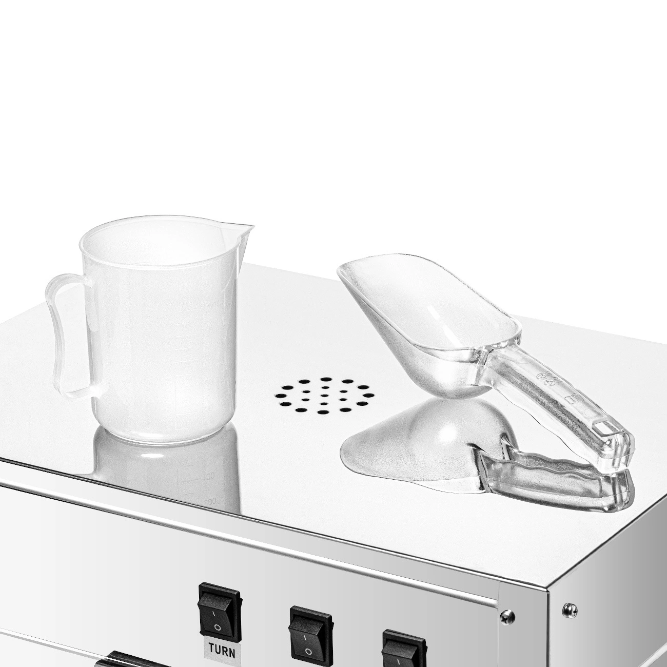 Stroj na popcorn FORGAST FG09305 je ideální pro profesionální použití na místech s vysokou návštěvností, jako jsou kina, eventové stánky, bary nebo food trucky. Zařízení je vybaveno vnitřním osvětlením, které zlepšuje viditelnost hotového popcornu a motivuje zákazníky k nákupu. Součástí sady je lopatka o objemu 220 ml a dávkovač 500 ml, které usnadňují rychlé porcování a servírování produktu. Dvířka z akrylu a stěny z tvrzeného skla zajišťují bezpečnost a umožňují efektní prezentaci popcornu.