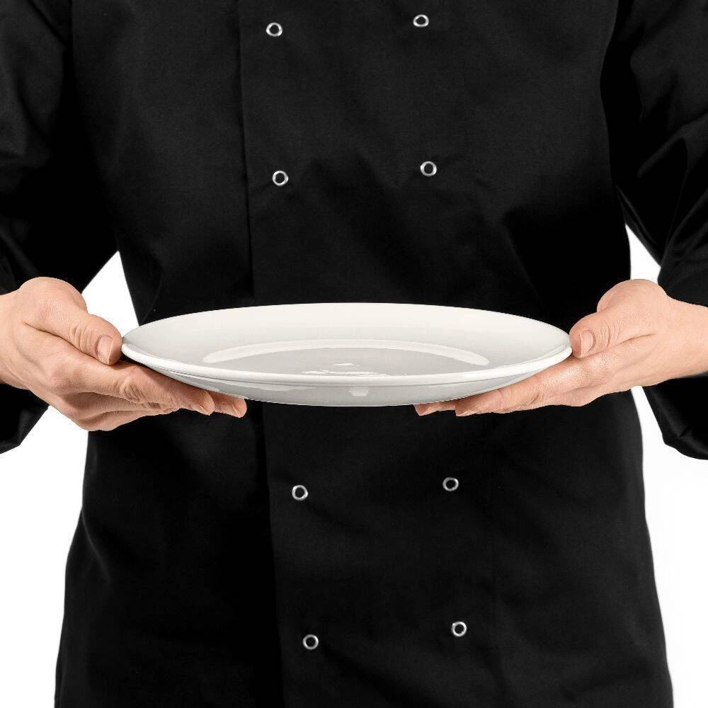• Bez okraje a klasický tvar – hladký povrch bez viditelných hran umožňuje estetické servírování pokrmů a usnadňuje stohování talířů. Díky tomu je talíř perfektní pro hlavní chody, předkrmy i dezerty.
