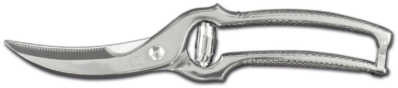 Nůžky na drůbež Ambrogio Sanelli Vyrobeno z nerezové oceli AISI 420B, tvrdost 54-55 HRC. Zahnuté čepele, spodní čepele s ostrými řeznými zuby. Nůžky mají tvarovanou rukojeť se zdrsněným povrchem, takže dobře padnou do ruky. Blokovací mechanismus zabraňující náhodnému otevření. Pružina, kteráóra usnadňuje hladký chod nůžek.