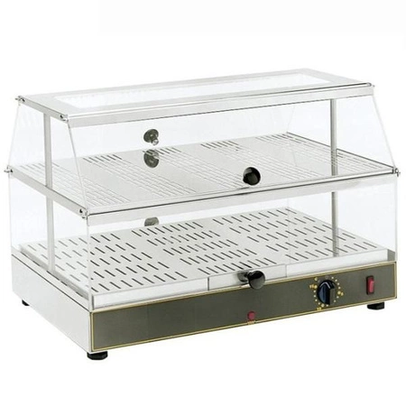 Průchozí vyhřívaná vitrína s zvlhčováním ROLLER GRILL WD 200 je profesionální zařízení určené pro gastronomii, které umožňuje prezentaci a udržování pokrmů v optimální teplotě po delší dobu. Díky funkci zvlhčování zaručuje čerstvost a lákavý vzhled servírovaných produktů, jako jsou pizza, plněné housky, croissanty nebo zapečené sendviče. Skvěle se hodí do cukráren, pekáren, obchodů a snack barů.