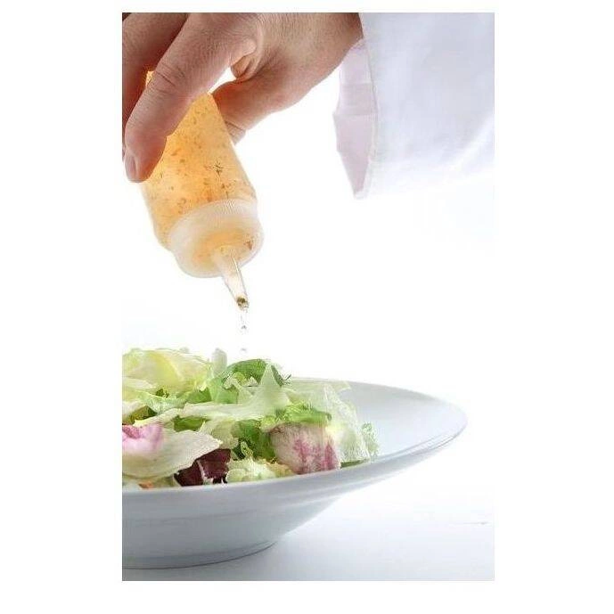 Průhledný dávkovač studené omáčky o objemu 0,35 litru - Sada 3 kusů. Vyrobeno z polyethylenu. Lze mýt v myčce nádobí. Zátka pro čistotu. Zátka udržuje omáčku déle čerstvou.